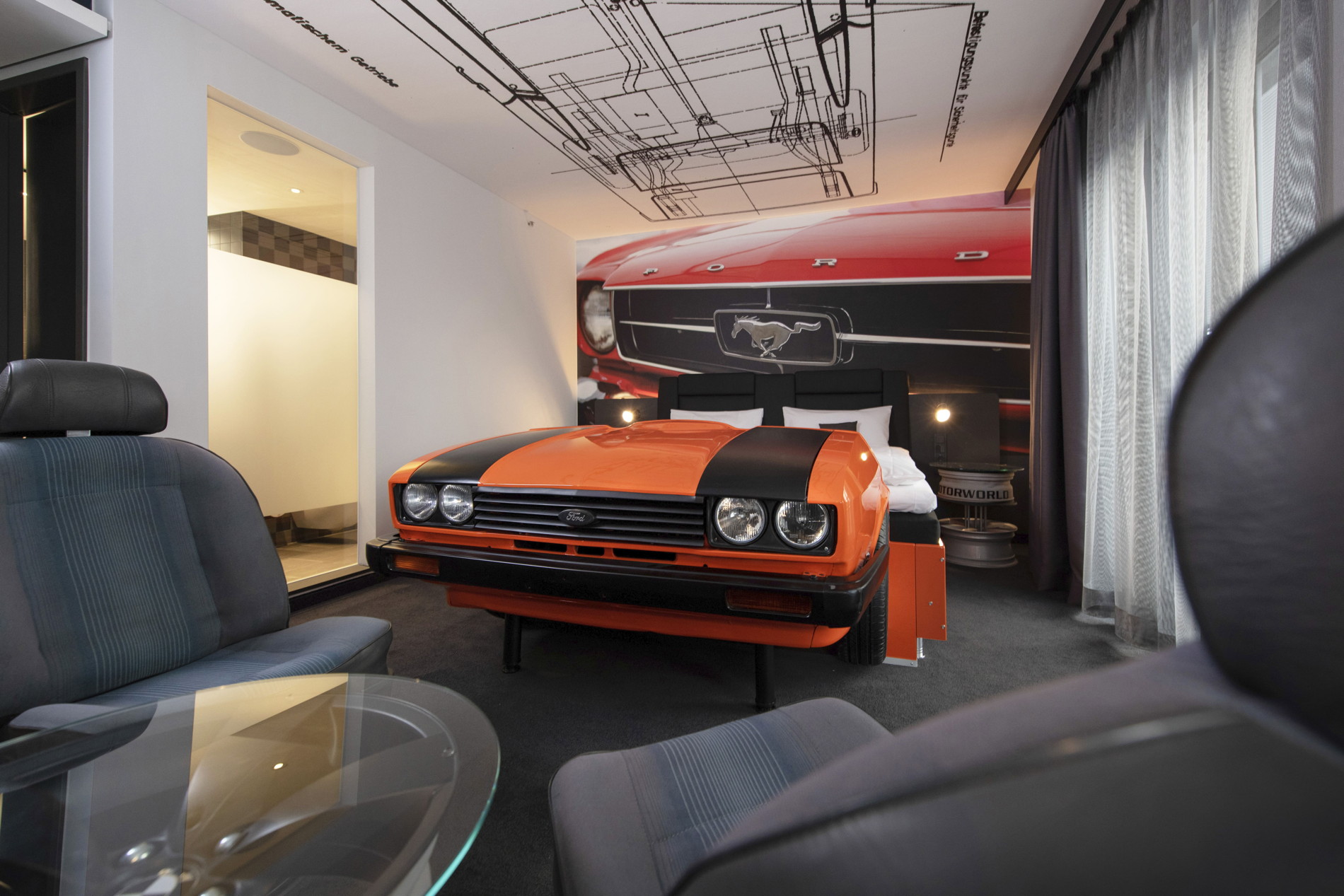 112 individuell gestaltete Zimmer, eine Racing-Suite und fünf Car-Suites erwarten die Gäste in Köln. In den Auto-Themenzimmern reicht das Hotelinterieur von zu Betten umgestalteten Karosserien automobiler Klassiker bis hin zu Wandgestaltung mit übergroßen Impressionen historischer Rennszenen. Möbel aus Zapfsäulen und zeitlosen Autoteilen runden das ganzheitliche Konzept ab. Die Car-Suites erlauben es zudem, das eigene Auto direkt neben dem Schlafzimmer zu parken und die großflächige Verglasung gibt den Blick auf das Fahrzeug frei.