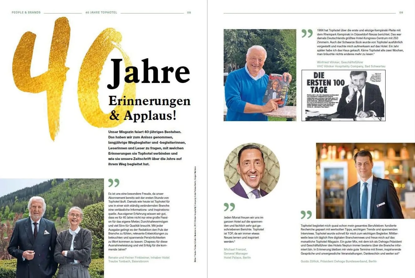Unser 40-jähriges Bestehen haben wir zum Anlass genommen, langjährige Wegbegleiter und -begleiterinnen, Leserinnen und Leser zu fragen, mit welchen Erinnerungen sie Tophotel verbinden und wie sie unsere Zeitschrift über die Jahre auf ihrem Weg begleitet hat. Erhalten haben wir wunderbare Anekdoten, herzliche Dankesworte und jede Menge Ansporn für unsere Arbeit.