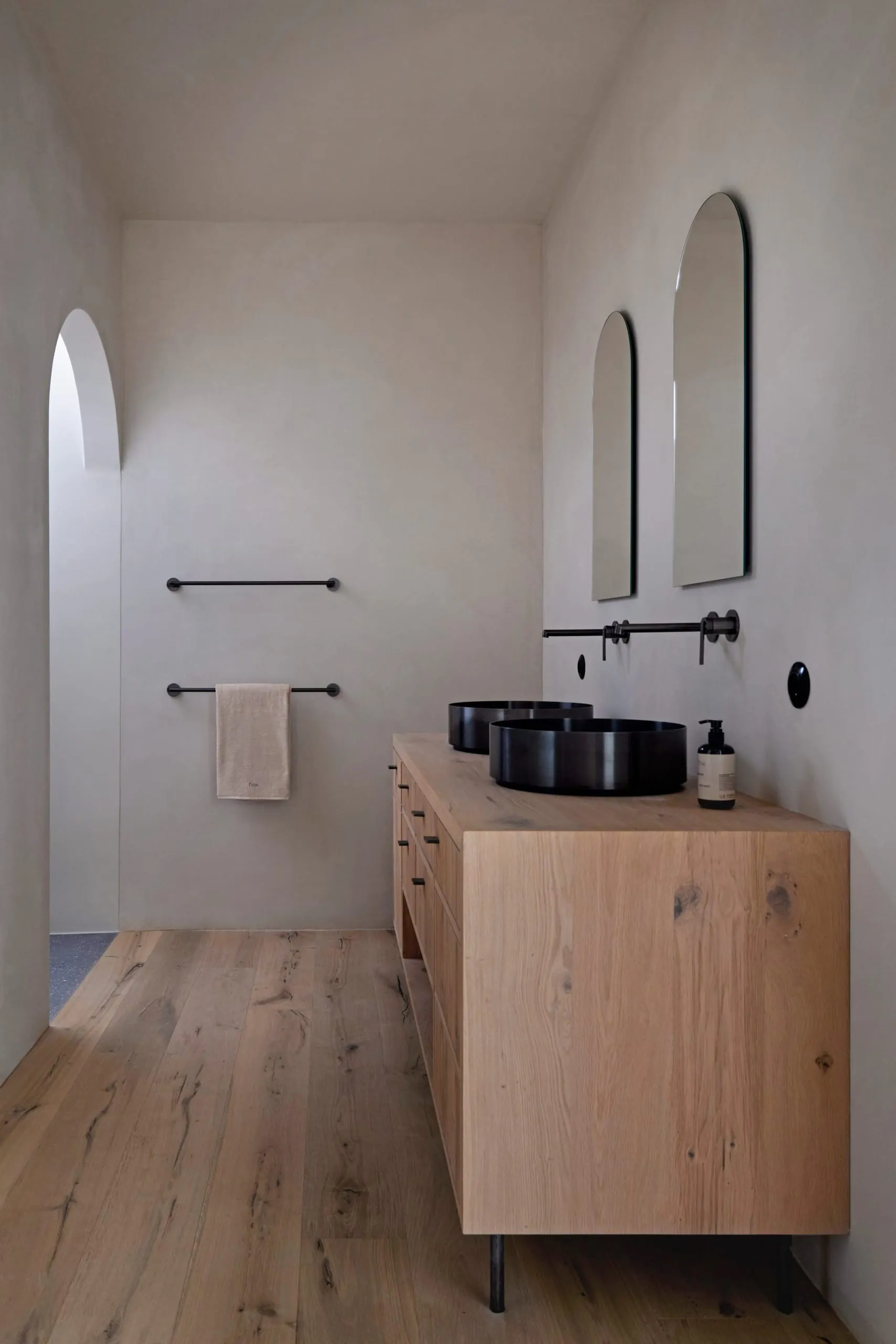Beim Umbau und der Neuausstattung kamen ausschließlich nachhaltige und ökologisch produzierte Rohstoffe zum Einsatz: Naturmaterialien für die Isolierung, Putz und Farben aus Kalk und Quarz sowie heimisches Holz, vorzugsweise Altholz.