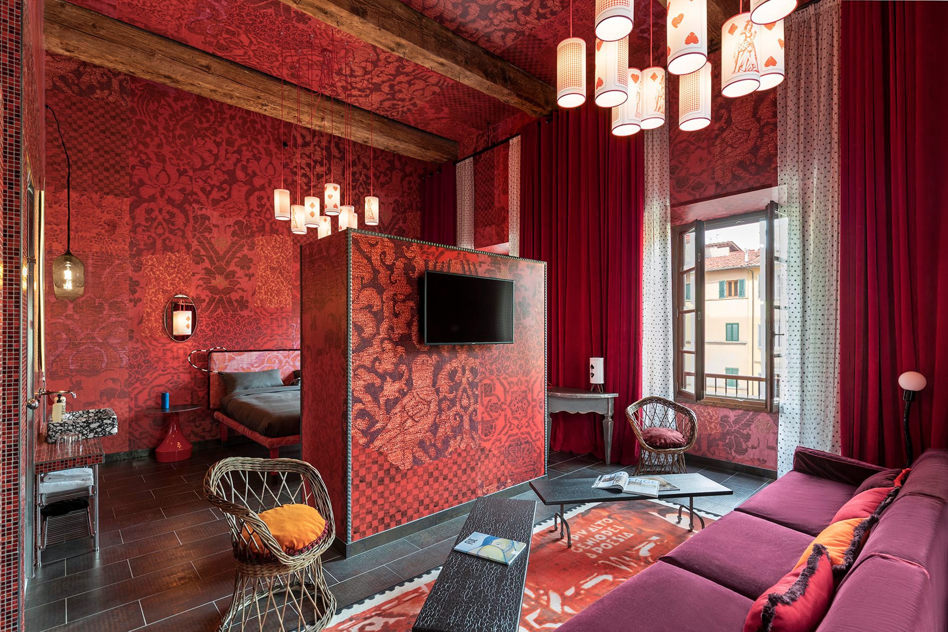 Das Design des 25hours Hotels folgt Dantes "Die Göttliche Komödie", die von der Mailänder Interior Designerin Paola Navone auf humorvolle Weise reinterpretiert wurde. Die Reise durch das mittelalterliche Meisterwerk startet an der Rezeption: Soll die Nacht im himmlischen Paradies oder eher in der lodernden Hölle verbracht werden? Die Gäste können selbst entscheiden, wo sie schlafen möchten – die Hotelzimmer sind in die beiden Stile Inferno und Paradiso unterteilt. Man wählt zwischen dunkelroten Zimmern mit Samtvorhängen und schwarzer Bettwäsche oder wolkenweißen Rückzugsorten mit ätherisch-blauen Akzenten.