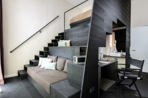 Vergleichbar sei das Almodóvar, so die Inhaberin, mit einem Viersterneplus-Hotel, der Ansatz sei dennoch ein anderer. Die Idee des Grandhotels als Luxusunterkunft ist aus der Sicht der Hotelière „relativ gestrig“. Zukunftsfähig sei vielmehr das Zuhause-Gefühl. „Das ist in unserer unglaublich dynamischen Gesellschaft ganz wichtig. Wenn man viel unterwegs ist, muss man zwischendurch Kraftorte finden: Sich einfach abends auf die Couch fallen lassen und es sich richtig gemütlich machen. Ich glaube, dass Hotels in Zukunft das leisten müssen.“ „Trial and Error“ Alexandra Müller-Benz ist Hotelière aus Leidenschaft, auch wenn sie kein Brancheneigengewächs ist. Ursprünglich hatte sie das Eckhaus in der Boxhagener Straße bauen lassen, um Schulungsräume für ihre Firma zu schaffen, die sich auf Gesundheitsbildung fokussiert hatte. Damit die übrigen Räume nicht leer standen, hatte sie beschlossen, ein Hotel zu eröffnen. Dadurch hatte sie eine ganz eigene Herangehensweise an ihr Hospitality-Konzept. „Das Almodóvar ist nichts, was in einer Kiste designt wurde und bei Eröffnung sofort zu 100 Prozent funktioniert hat. Wir haben schon sehr viel ausprobiert, vor allem was das Interior betrifft. Wir sind in einem ständigen Wandel. Wenn wir wieder auf etwas Neues stoßen, probieren wir es aus, und entweder es funktioniert oder eben nicht“, betont die Eigentümerin. So zum Beispiel die Bänke, die aus Getränkedosen gefertigt wurden. Sie hielten nur ein paar Jahre, weshalb sie mittlerweile durch andere Möbel ersetzt worden sind. Durch „Trial and Error“ bleibe das Hotel agil. Auch, wenn größere Veränderungen anstehen. „Ich habe mich vor einiger Zeit von der Firma, die Gesundheitsbildung anbietet, getrennt. Ich wollte mich auf eine Sache konzentrieren und habe mich für das Hotel entschieden. Die Konsequenz war, dass wir plötzlich sehr viel Platz zur Verfügung hatten.“ Doch nicht nur das: Die freien Räume waren mit 4,50 Metern viel höher als die übrigen Zimmer. Was also damit tun? So entstand die Idee zu den Loftzimmern mit ihrem ganz eigenen Stil. Das Bett auf der Mezzanine-Ebene erreichen die Gäste bequem über breite Stufen, die den Schlafraum vom offenen Bad, dem Ankleidebereich und dem Schreibtisch mit Regiestuhl abgrenzen.