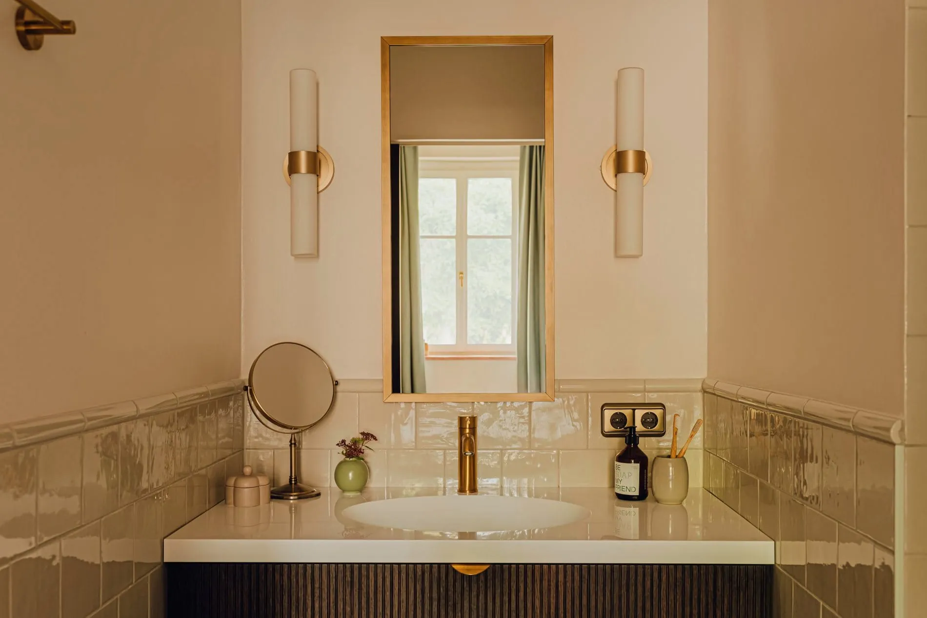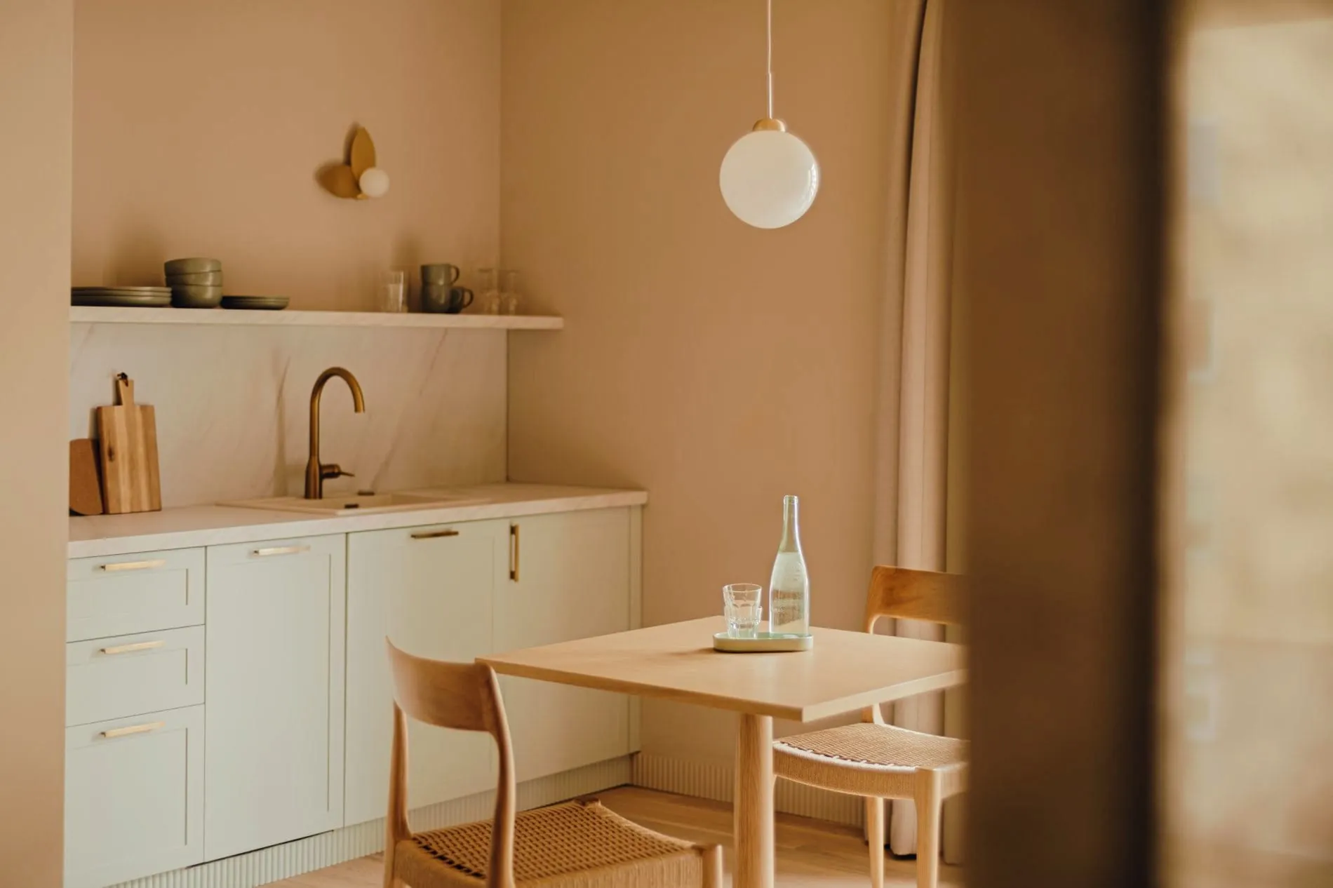 Harmonisch komponiert: Beigetöne, geriffeltes Holz und glänzende Fliesen.