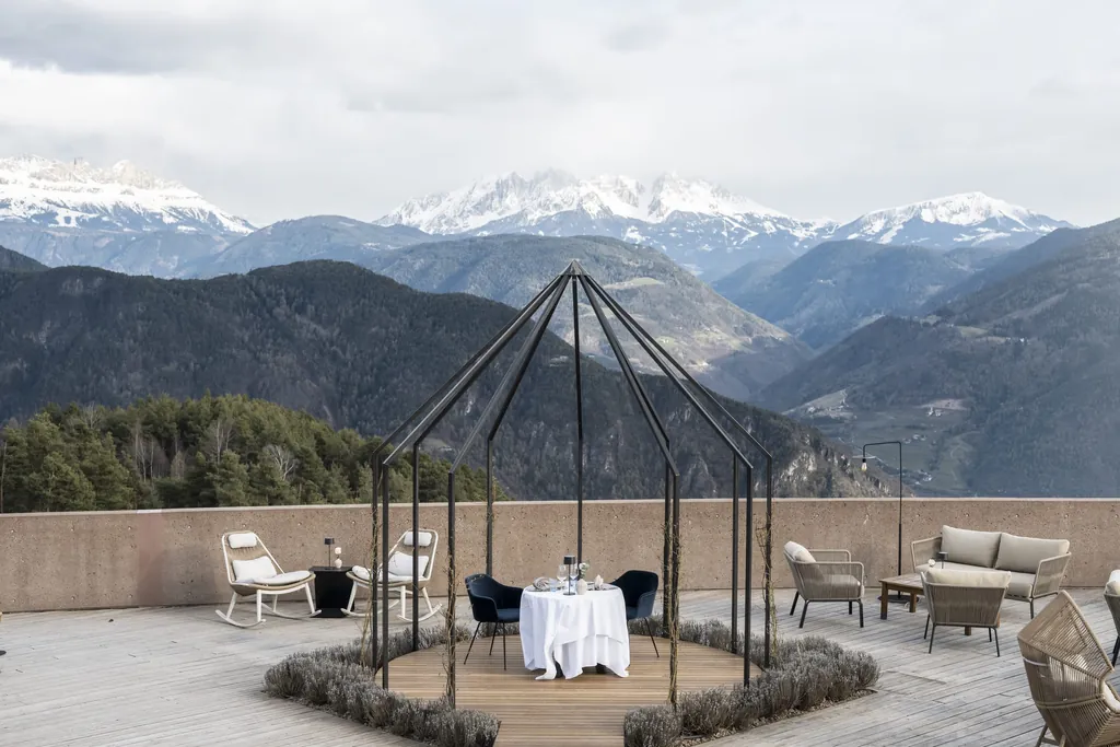 Maßnahmen: Das hoch über Bozen gelegene Hotel hat einen neuen Panorama-Speisesaal eingerichtet. Der Blick auf die Dolomiten wird damit noch besser genutzt. Auch die Bar Lounge erhielt ein neues Design, Mittelpunkt ist ein schwebender Kaminofen. Auf der vergrößerten Terrasse steht nun ein Pavillon (siehe Bild), perfekt für einen Heiratsantrag oder einen besonderen Anlass. Zudem wurden die Zimmer renoviert und mit Naturwaschbecken aus Südtiroler Serpentinstein ausgestattet. Auch der Wellnessbereich wurde vergrößert.