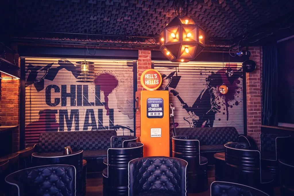 Maßnahmen: Rockmusik trifft Erholung Nach diesem Motto renovierte Familie Falter den Barbereich ihres 20-Zimmer Hotels. Auf bestehender Fläche entstand ein drittes Restaurant mit Bar und Bühne für kleine Veranstaltungen. Die Atmosphäre erinnert an Band-Proberäume und setzt auf +Upcycling: Ausgediente Grammophon-Schalltrichter und Snaredrums dienen als Leuchten, Instrumentenkoffer als Sitzplätze. Bassboxen umrahmen die Spiegel in den Sanitärräumen. Nachhaltig ist auch der Patchwork-Boden, der aus Teppich-Restposten des Unternehmens Tarkett besteht.