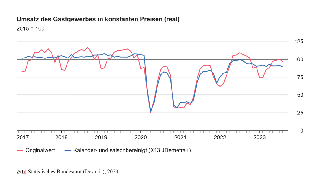 Die Erlöse sanken gegenüber dem Vormonat Juli 2023 sowohl bereinigt um Preiserhöhungen (real) als auch nominal um jeweils gut zwei Prozent, wie das Statistische Bundesamt (Destatis) nach vorläufigen Ergebnissen weiter mitteilte. Hotels und sonstige Beherbergungsunternehmen verbuchten im August gegenüber dem Vormonat ein reales Umsatzminus von 1,2 Prozent. Gaststätten, Restaurants und Co. erlösten preisbereinigt 2,2 Prozent weniger als im Juli.