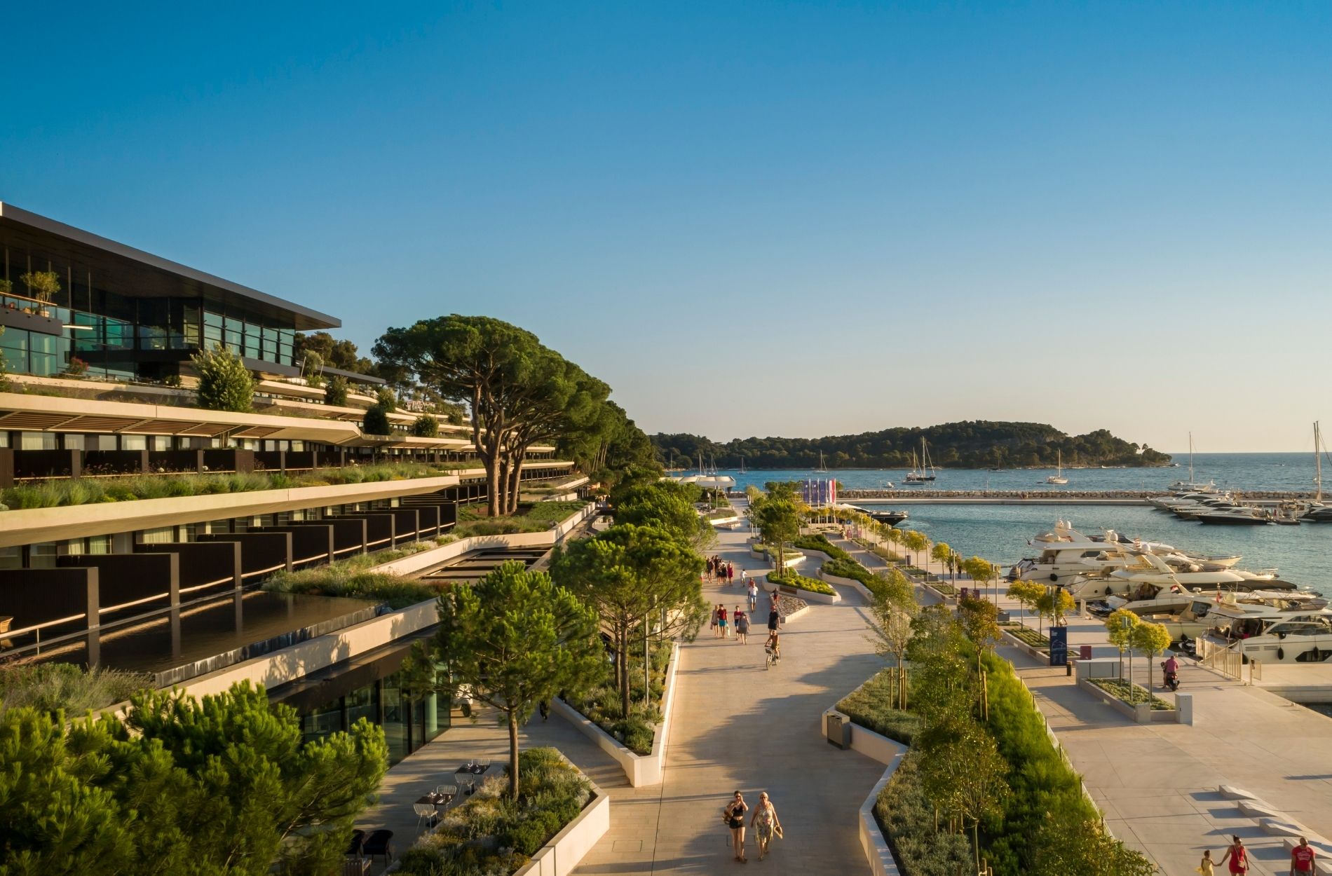 Zudem verfügt es in den beiden oberen Etagen über einen sehr großzügigen 3.800 Quadratmeter großen Wellness- und Spa-Bereich mit insgesamt drei Innen- und Außenpools, mit Blick über die Bucht von Rovinj. Die Zufahrt und der Zugang in das Hotel erfolgen von der Landseite aus über die 5. Etage. Das Hotel hat eine extensive Tiefgarage, die in den Küstenfelsen eingebettet ist und auch über einen von der Marina Ebene zugänglichen öffentlichen Teil verfügt.