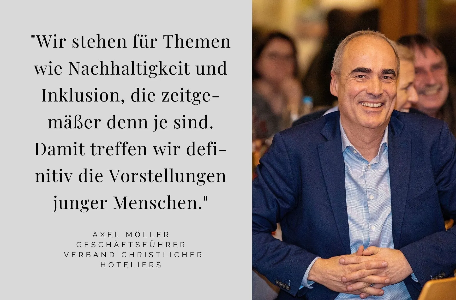Axel Möller: Das sind in erster Linie Werte wie Nächstenliebe und Fürsorge, aber auch eine vorbildliche Haltung etwa zu Nachhaltigkeit oder Inklusion. Mit Blick auf die doch sehr unterschiedlichen Hotelwelten und Menschen in unserer Kooperation, vom Pfarrer im Klosterhotel bis zum Hotelmanager im Businesshotel, ist auch Vielfalt ein Wert, den ich damit verbinde.