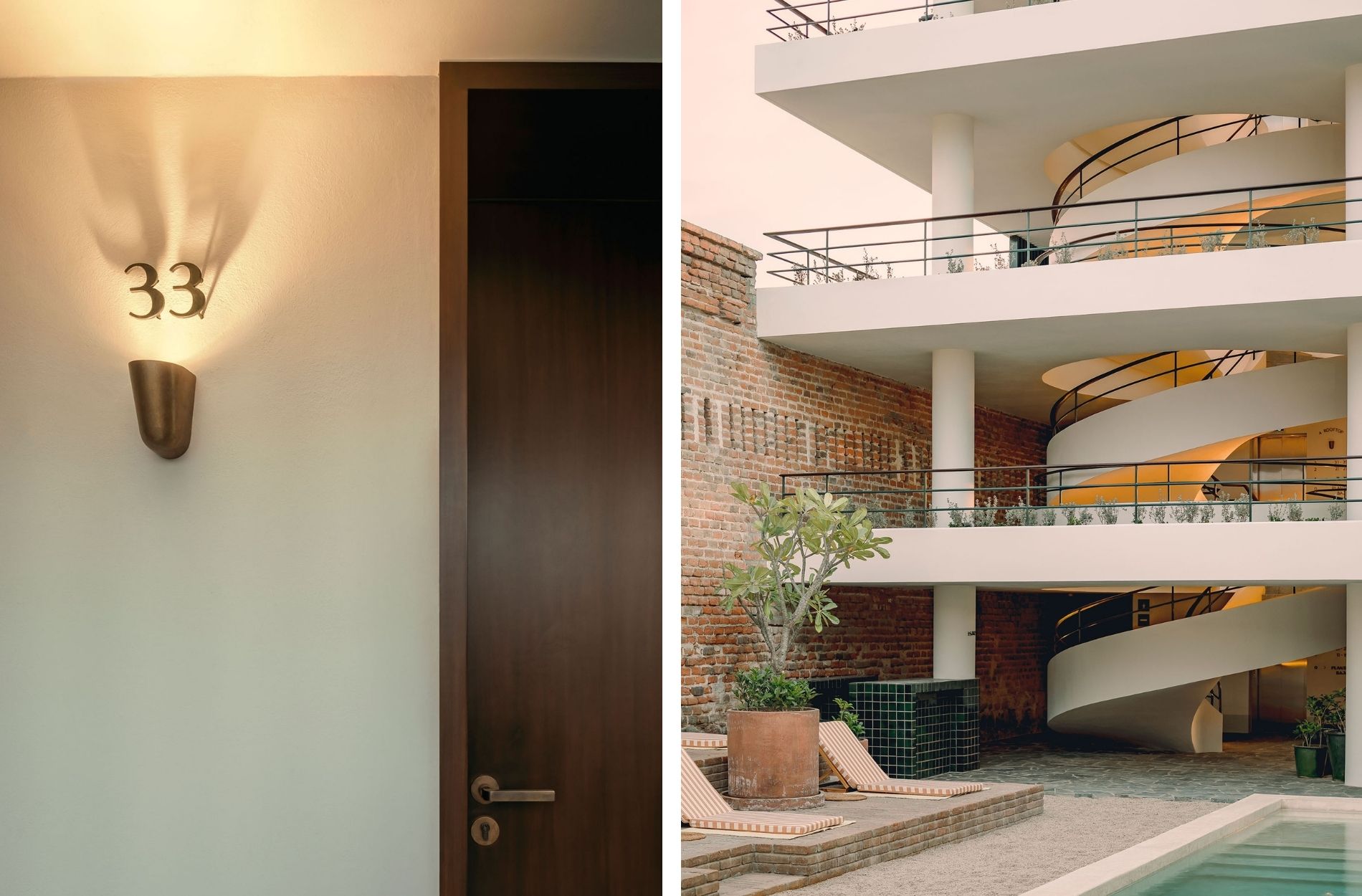 Eine skulpturale Wendeltreppe im Innenraum verbindet unterschiedliche Bereiche des Hotels miteinander, von denen aus diverse Terrassen Aussicht auf das Meer bieten. Während die äußere Erscheinung minimalistisch elegant gestaltet wurde, sollen die vom französischen Innenarchitektur Duo Jaunue gestalteten Innenräumen Brücken zu mexikanischer Bautradition schlagen: Die Farbtöne des Hotels verweisen auf ursprüngliche Details des Anwesens, wie die handwerklich hergestellten Terrazzofliesen, das traditionelle Holzfachwerk oder mundgeblasene Glasleuchten in transparenten und bernsteinfarbenen Tönen.