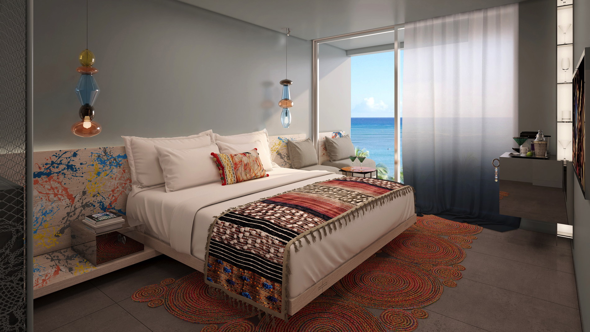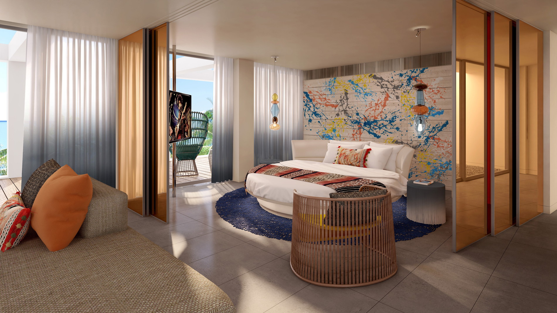 Die 162 design-orientierten Gästezimmer und Suiten sollen "einen neuen, extravaganten Luxus" auf die Insel bringen. Alle Zimmer bieten hierbei das charakteristische W-Bett mit üppiger Bettwäsche und bequemen Kissen. Auch eine "Extreme Wow Suite" fehlt nicht. In allen Einheiten fällt der Fokus sofort auf die zahlreichen Farbkleckse, die den Wänden einen bunten Touch bescheren.
