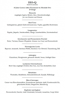 Zu entdecken gibt es dort beispielsweise: Hamachi mit eingelegtem Ingwer, Rettich, Miso, Zitrusfruchtsaftgel oder Langoustino mit Paprika, Jalapeño, Staudensellerie, Mango, Limettenblätter und Krustentierfond oder Rehrücken mit Wacholder, Heidelbeere, Holunderblütensaft, Kamille und Pfifferlinge. Den Abschluss bilden Bleu d’Auvergne, eine Creme vom Blauschimmelkäse mit Koriandersaat, gedörrtem Apfel, Kondensmilch-Eis,getrocknetem Biskuit, Bergamotte, Balsamessig und Kopfsalat und Joghurt mit Passionsfrucht, Karotte, weißer Schokolade, Lavendel, Amarettini, Crispy Müsli.