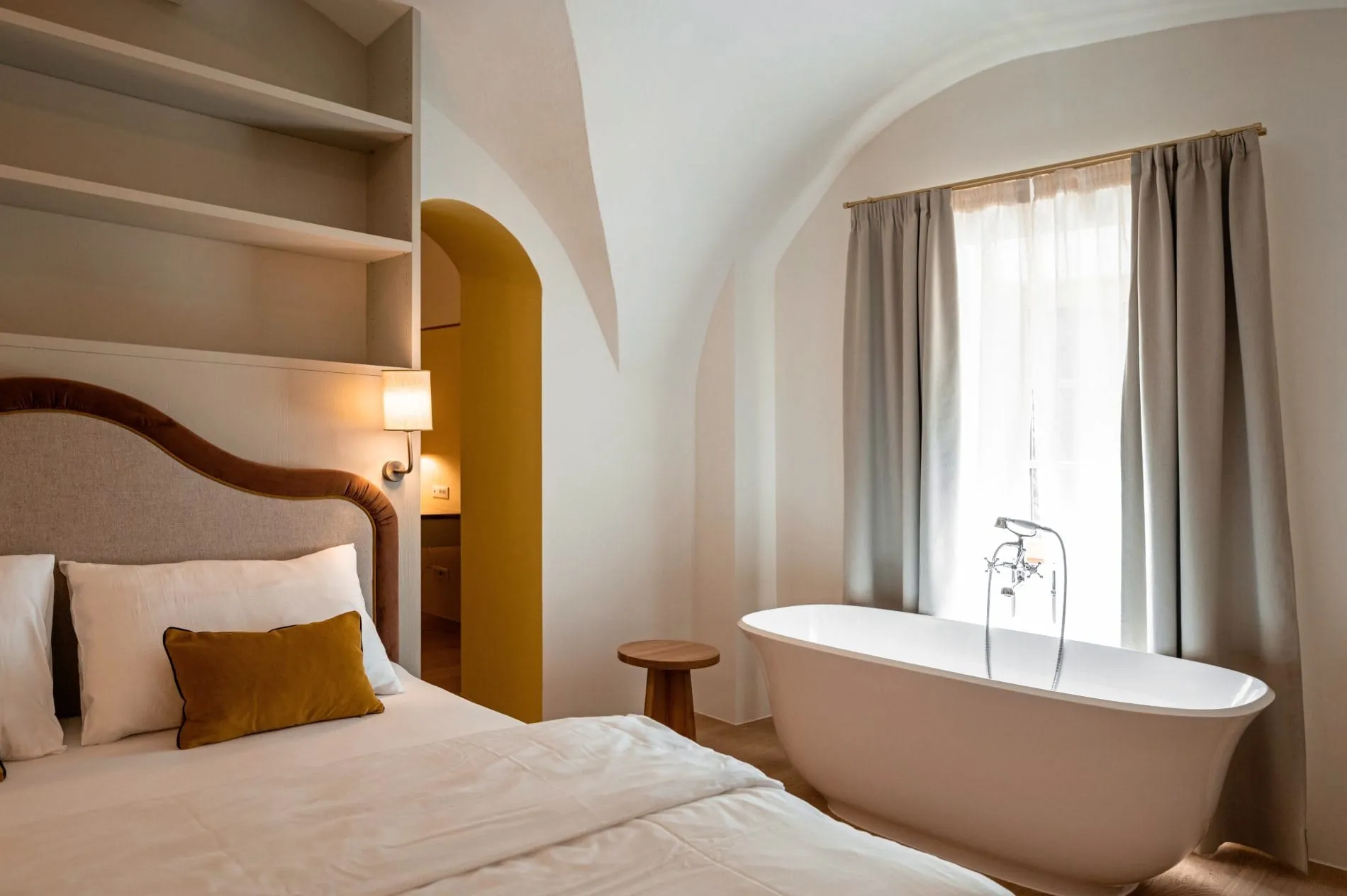Die Gegensätze, die hier spannend miteinander verwoben werden. Hier dieses alte, ehrwürdige Haus und dort die jungen Betreiber, die alles anders machen, dabei aber den Fokus fürs Wesentliche nicht verlieren. Dann diese alten, rohen Mauern, die wir immer wieder mit starken, modernen Farbwelten brechen – vor allem in den Bädern und Zwischengängen. So ist es uns gelungen Bestehendes zu erhalten und trotzdem die Zukunft einzuladen. Das erzeugt ein bereicherndes Spannungsfeld.