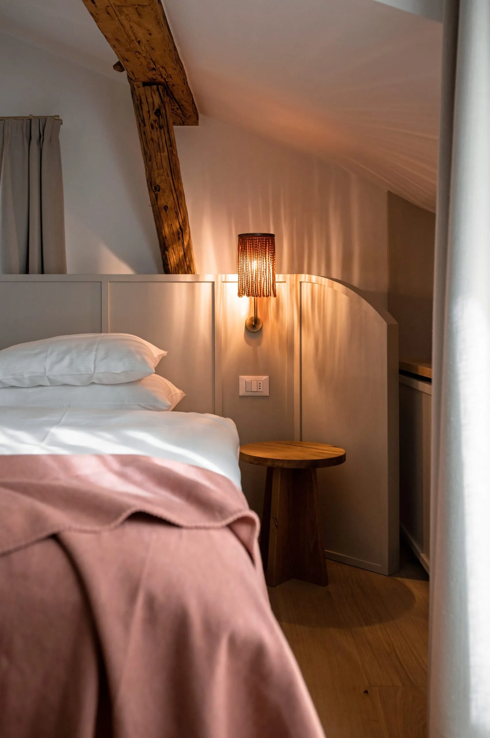Verantwortlich für das Design zeichnet Architektin Christina Biasi-von Berg, die mit ihrem Mann das Büro Biquadra in Meran leitet. Ihr Anliegen bei den Sanierungsarbeiten: die Historie zu bewahren und sie mit modernem Design zu kombinieren. So bewahrte sie viele Originale wie die historischen Möbel oder den Holzboden. Die zwölf Zimmer sind nach Weinriegeln rund um den Kalterer See benannt.