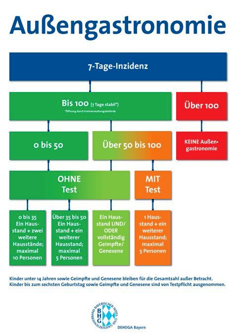 Angesichts der Öffnung der Außengastronomie hat der Bayerische Hotel- und Gaststättenverband ein Schaubild erstellt, das Auskunft darüber erteilt, bei welchen Inzidenzwerten Testungen erforderlich sind und welche Auswirkungen sie auf die Zusammensetzung an einem Tisch haben. „Es ist mitnichten so, dass alle Gäste getestet sein müssen“, erklärt Dehoga-Bayern-Landesgeschäftsführer Dr. Thomas Geppert in einer offiziellen Mitteilung des Verbandes. „Laut Verordnung müssen Negativtests nur vorliegen, wenn Personen aus mehr als einem Hausstand an einem Tisch sitzen, die weder geimpft noch genesen sind.“