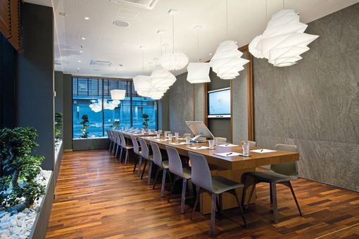 „Der ideale Ort zum Arbeiten ist einer, an dem es um mehr geht als um die Arbeit. Es ist ein Ort, der uns mit Gleichgesinnten verbindet.“ Gemäß dieses Leitspruchs und der Umsetzung der „Lean-Luxury“-Idee innerhalb einer Bürofläche erwartet die Nutzer eine vielfältige Welt, die hell und einladend ist, und deren Gestaltung jener der Ruby Hotels entspricht. Empfangen werden sie in einem großzügigen öffentlichen Bereich, dessen Mittelpunkt eine „Community Cooking & Dining Area“ bildet – eine Art Selbstbedienungs-Kaffeebar mit Küchenzeile. Neben diesem offenen Großraum mit Tischen und Stühlen, gemütlichen Sofas sowie einer riesigen Dachterrasse verfügt Ruby „Leo Workspaces“ über zahlreiche weitere Bereiche, die vielfältige Arbeitsweisen unterstützen: unterschiedlich große Konferenzräume, abgeschlossene Gruppenarbeitsräume, aber auch als Ganzes mietbare Einzelbüros sowie abgeschiedene Rückzugsbereiche, z.B. zum Telefonieren oder konzentriertem Arbeiten.
