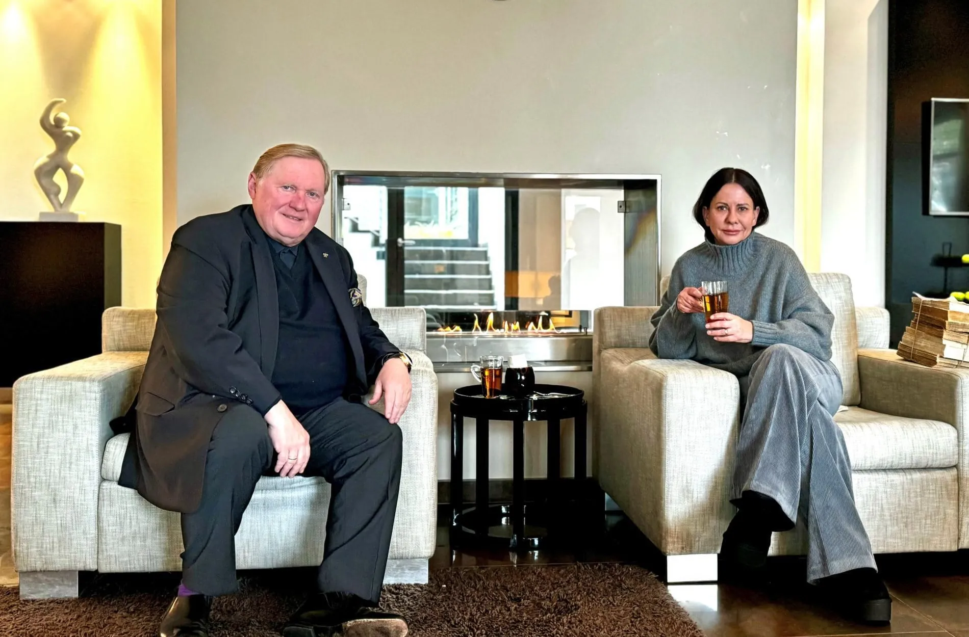 Mit sinkenden Temperaturen findet man Michael und Stephanie Teigelkamp, Gastgeber des Relais & Châteaux Hotels Burg Schwarzenstein in Geisenheim-Johannisberg, vor dem Kamin in der Lobby. Dort genießen sie in ruhigen Minuten gern gemeinsam ein Glas ihres liebsten Wintergetränks Rooibostee. „Das ist dann richtig hyggelig“, schwärmt Stephanie Teigelkamp. Bei klarem und warmem Wetter entspannt das Hoteliersehepaar am liebsten auf der Terrasse mit Blick über die Weinreben und den Rhein bis nach Rheinland-Pfalz, ein weiterer Lieblingsplatz von beiden.