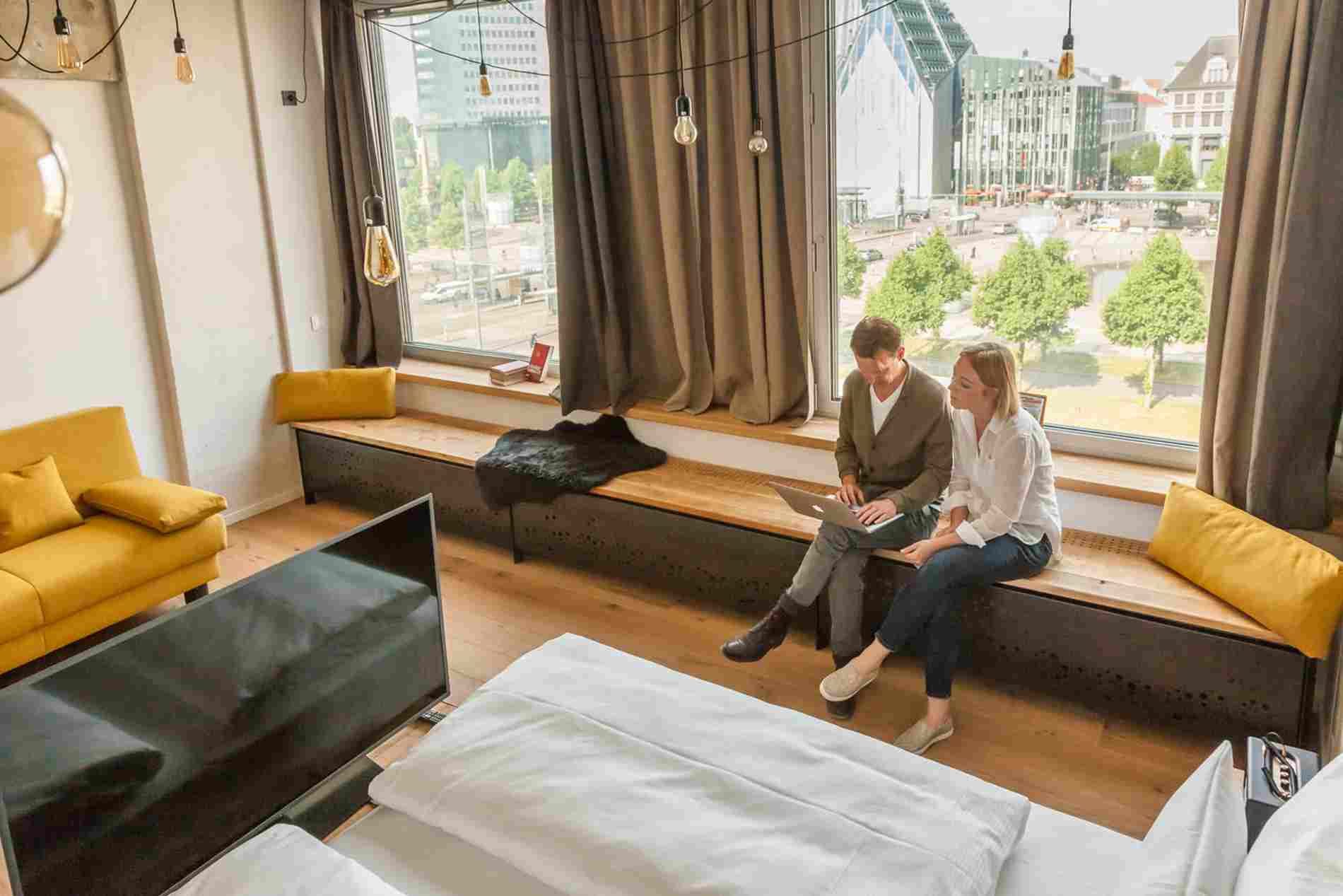 „Die Mischung der wenigen, aber großen Anker-Mieter ist perfekt“, so Wilhelm Andreas Büscher. Sie alle werden zweimal im Jahr zum Mieter-Kick-off eingeladen, das Team des Lebendigen Hauses ist jeden Tag für die Mieterfragen präsent. Die Bewohner wiederum nutzen die Afterwork-Abende, die Felix-Suiten bieten ihren Gästen zudem attraktive Coworking-Angebote von Design Offices, und Motel One empfiehlt seinen Gästen die Fitnessmöglichkeiten im Areal. Longstay-Gäste können alles im Haus nutzen, eine App vernetzt die Konzepte miteinander. Sie wird ergänzt um neue, direkte Buchungsmöglichkeiten im Haus.