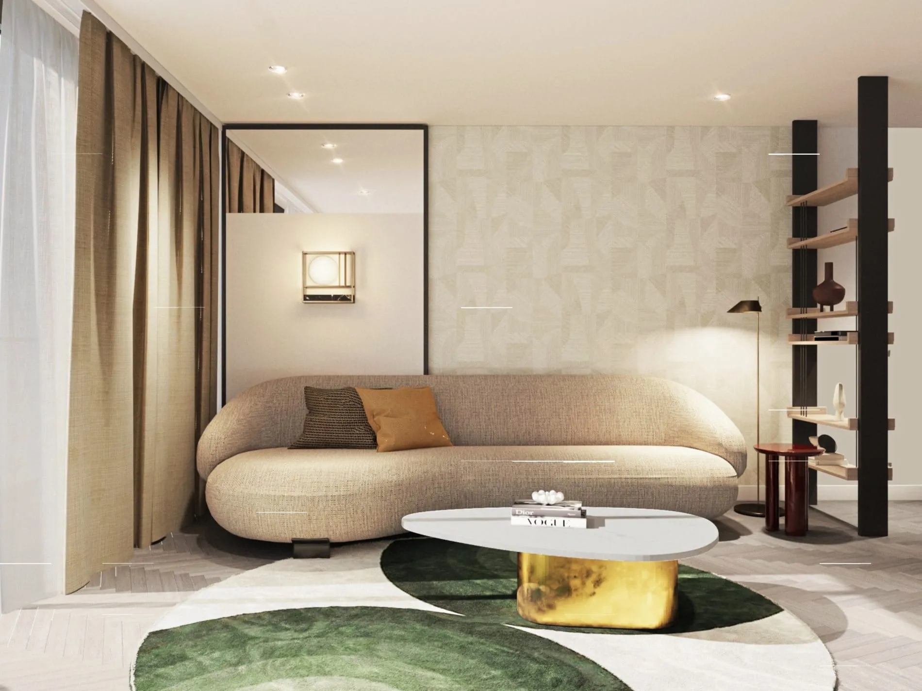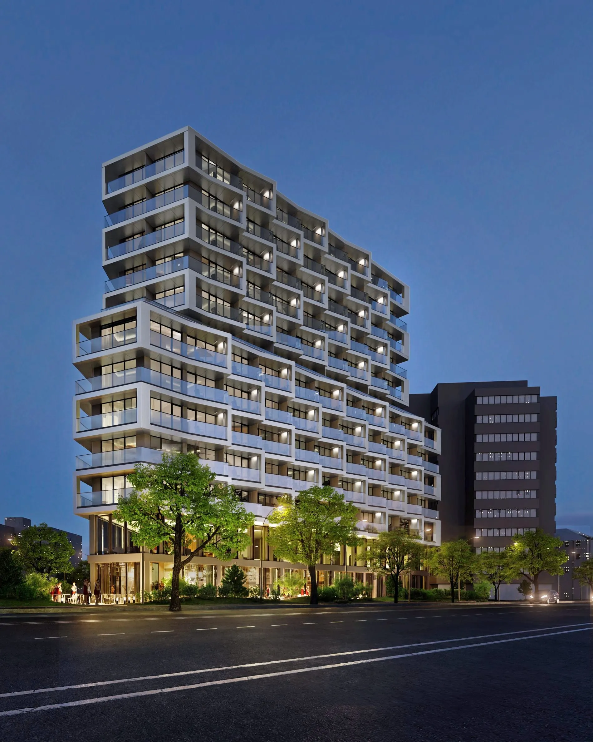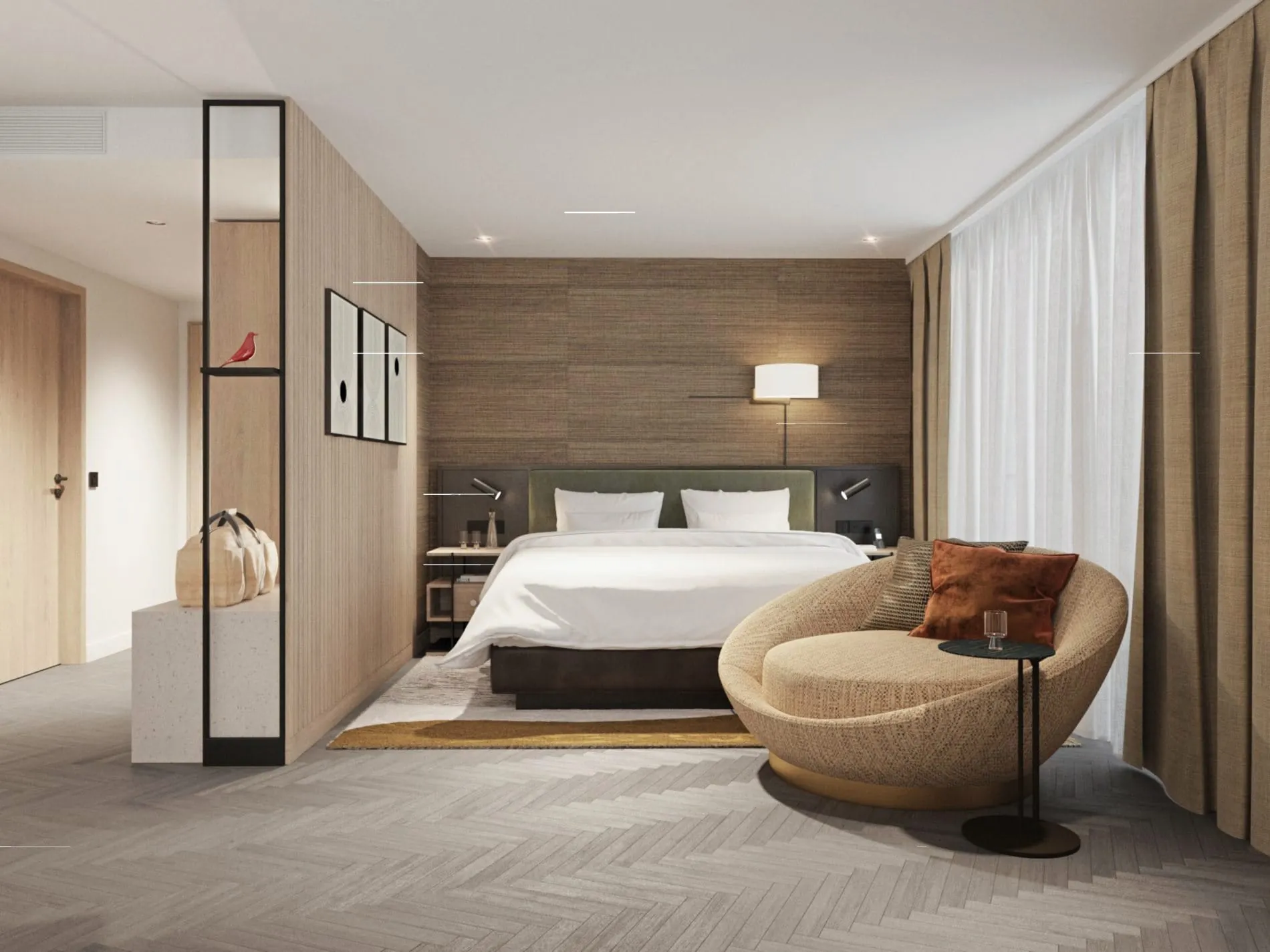 Um die Ecklage an der Kennedy-Allee 89 zu betonen, spiegelt die markant geschwungene Fassade des Neubaus – entworfen vom Architekturbüro Eike Becker – den Flusslauf des Mains wider. Das geometrische Design und der kubisch inspirierte Grundriss des Hotels werden durch eine Innenausstattung komplettiert, die vom Studio Lux Berlin entworfen wurde und eine Anspielung auf den Designstil der 1960er Jahre ist.