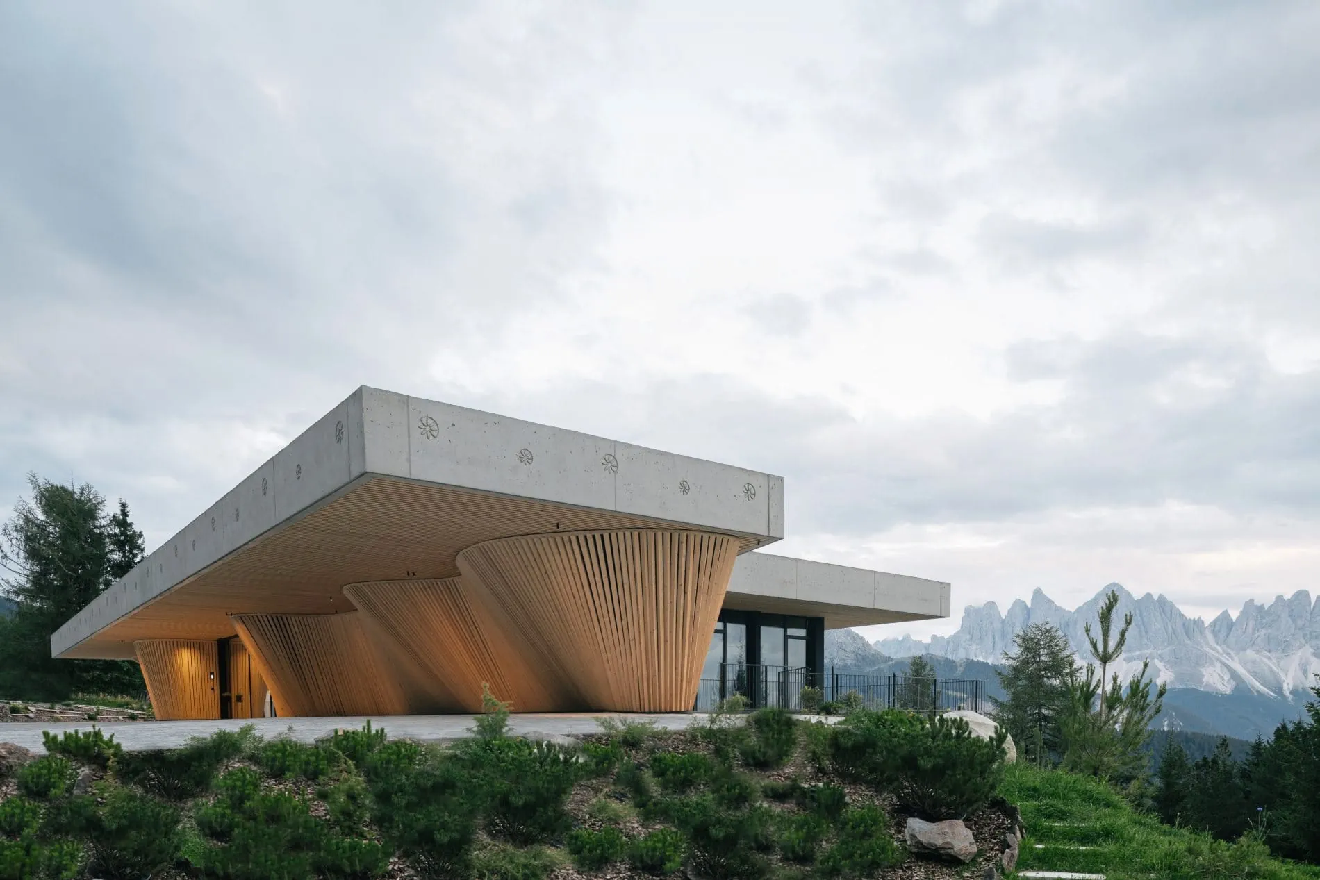 Wie ein Schirm ragt das flache Betondach über die gebürstete, wellenförmige Fichtenfassade hinaus, die dem Gebäude die skulpturale Form und mit ihren Reflexionen Sinnlichkeit verleiht. Auf der Straßenseite sind durch den Überstand die Fahrzeuge der Hotelgäste vor Sonne und Schnee gut geschützt.