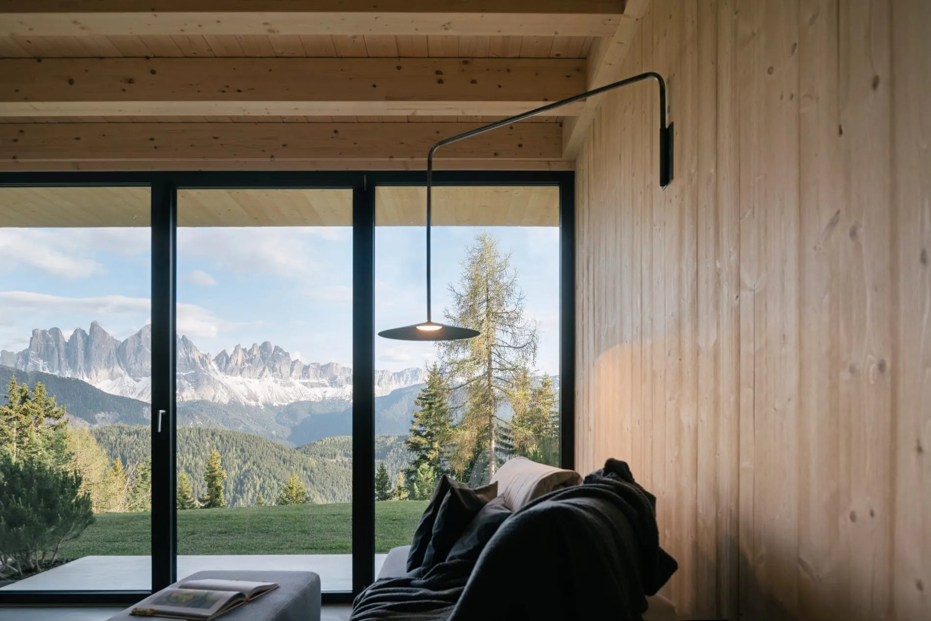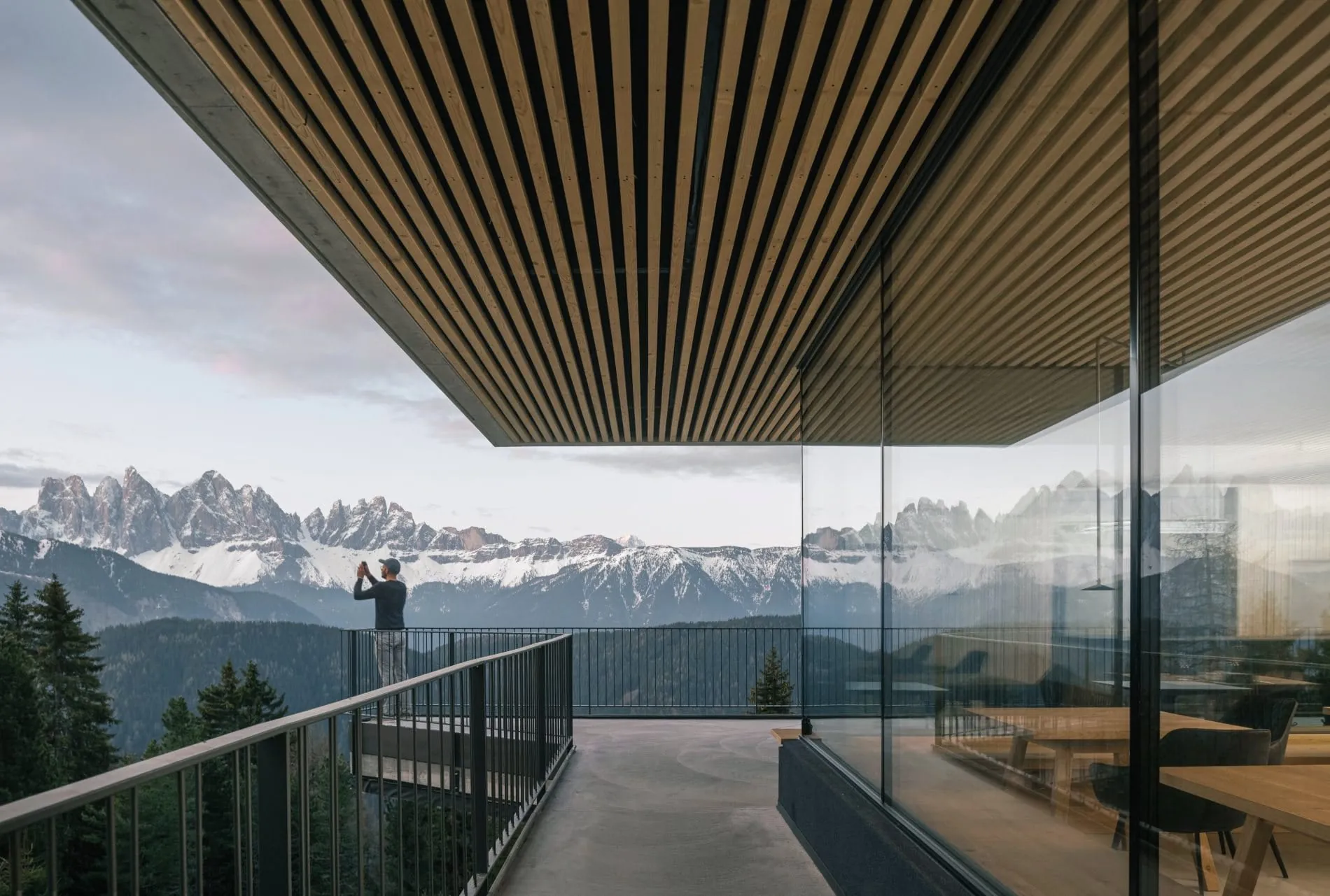 Von der schmalen, sich den Berg hochschlängelnden Straße aus ist sogar nur eine Ebene zu sehen. Der umgebenden Natur wird aus Gästesicht eine Bühne bereitet. Ob von der Restaurantterrasse, aus der ein kleines Aussichtsplateau auskragt – Martin Gruber nennt diese gestalterische Finesse ein „Aussichtstrampolin“ – oder vom Sofa beziehungsweise Bett in den Suiten: Der unverbaute Blick auf die Dolomiten, konkret die Geislergruppe, ist freigegeben. „Gebäude und Berg in Harmonie“ – das war Martin Gruber bei der Planung wichtig, der bei dem ambitionierten Bauprojekt Alpentradition und urbane Modernität in Einklang brachte. Holz, Glas und Sichtbeton, der optisch beinahe nahtlos zur rauen Bergwelt passt, bilden den minimalistischen Materialdreiklang.