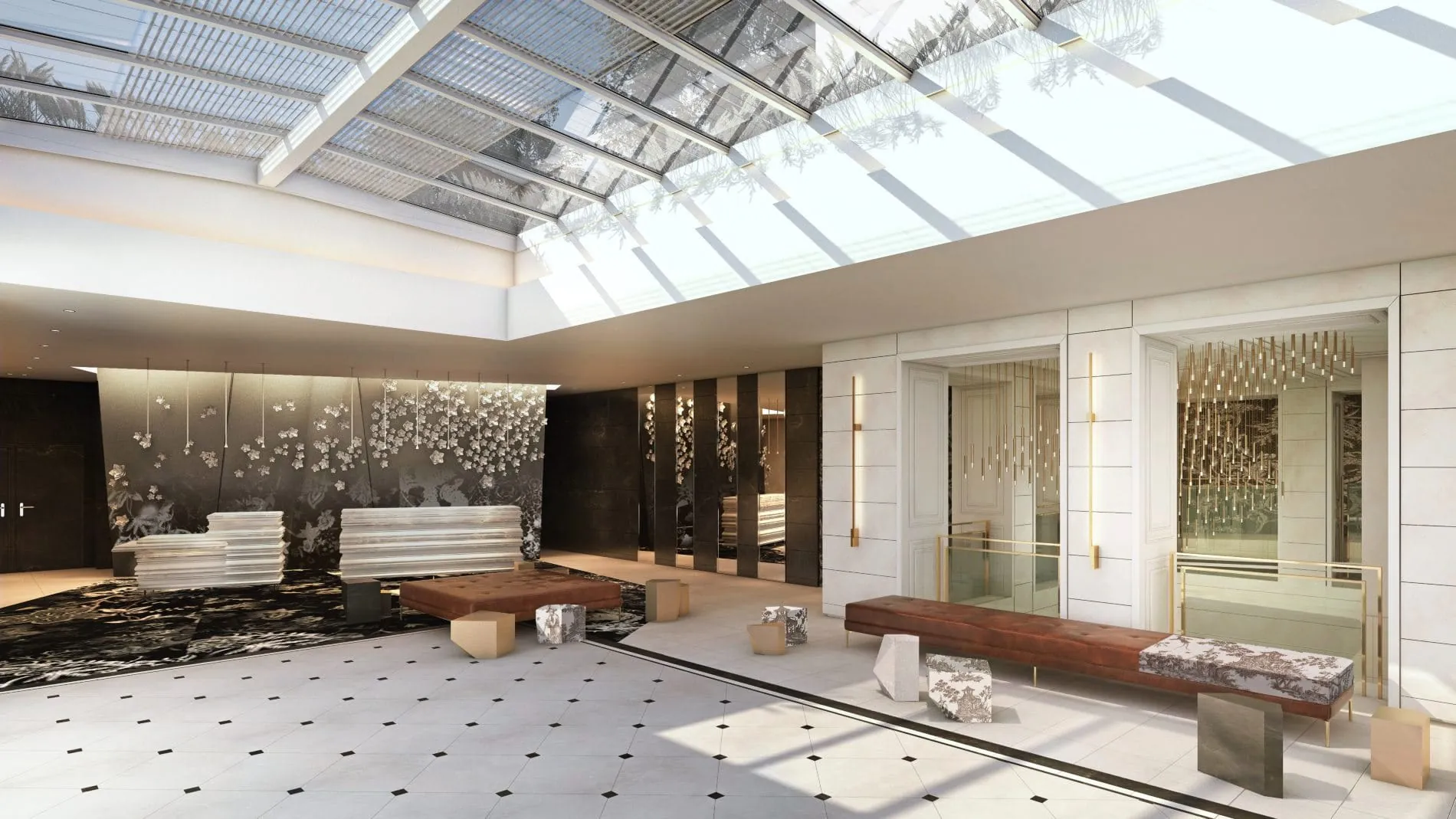 So integrierten die Innenarchitekten und Szenografen rund um das Designstudio Flamant Interior Designs (FID) etwa großflächige zeitgenössische Kunstwerke, die den Gästen direkt bei der Ankunft ins Auge fallen werden: Das Werk „Long Term Parking“ von Arman (1982) beispielsweise ist eine Skulptur aus 59 in Beton eingeschlossenen Automobilien, die zusammen einen 18 Meter hohen Turm bilden. „Hommage à Eiffel“ von César (1989) präsentiert eine monumentale, drei Meter hohe Tafel aus Originalteilen des Eiffelturms.