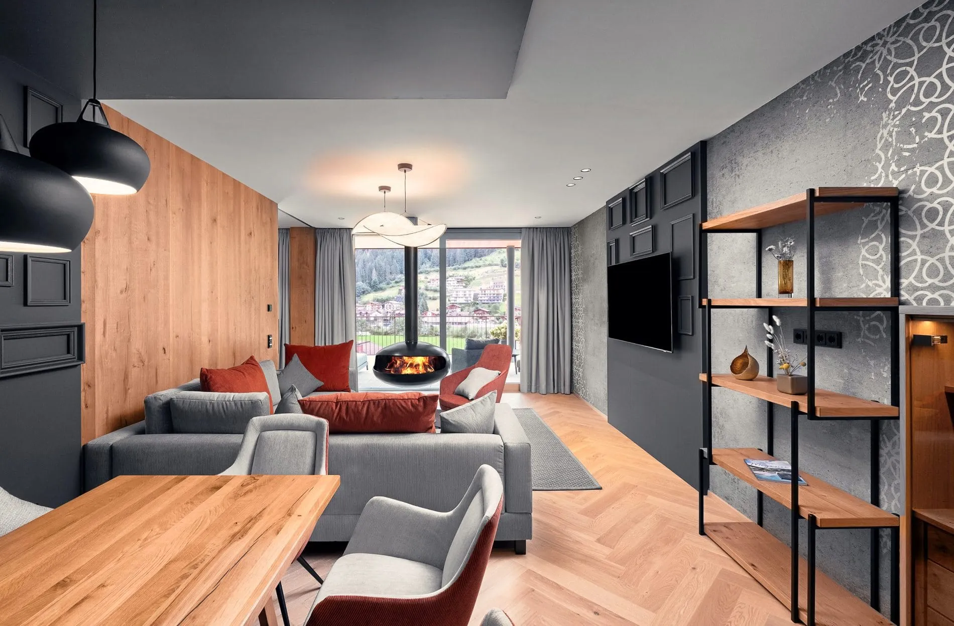 Blick in die Top-Suite Deluxe: Großzügiger Wohnraum mit Kamin und Essbereich.