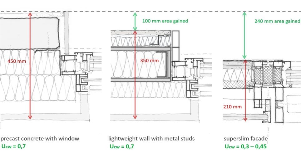 Dank innovativer Materialien, darunter vor allem nachhaltige Dämmstoffe, weist die Fassade ausgezeichnete Wärmedämm- und Schalldämmwerte auf – und das mit einer thermischen Hülle von nur 90 Millimetern Aufbau. Möglich wird das durch eine Kombination aus Vakuumisolationspaneelen und Dämmplatten aus Siliziumdioxidschaum. Insgesamt ist die Fassade in Kombination mit den Photovoltaikelementen nur 210 Millimeter dick. Eine konventionelle Konstruktion hätte für einen vergleichbar guten Schallschutz einen Gesamtaufbau von mindestens 450 Millimetern benötigt.