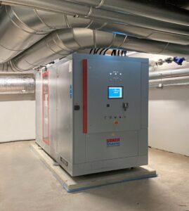 Bei letzterem fiel die Wahl erneut auf Sokratherm, genauer auf deren neu entwickeltes BHKW-Kompaktmodul "Typ GG 355" mit aufgeladenem 8-Zylinder-Man-Motor. Das Modell hat eine elektrische Nennleistung von 357 Kilowatt bei 455 Kilowatt Wärmeleistung und einem Gasverbrauch von 889 Kilowatt, wird vor Ort aufgrund der geodätischen Höhe jedoch mit einer um knapp 10 Prozent niedrigeren Leistung betrieben. Der elektrische Wirkungsgrad von 40,2 Prozent sowie 90,3 Prozent Gesamteffizienz sind auch bei der abgesenkten Leistung praktisch gleich.