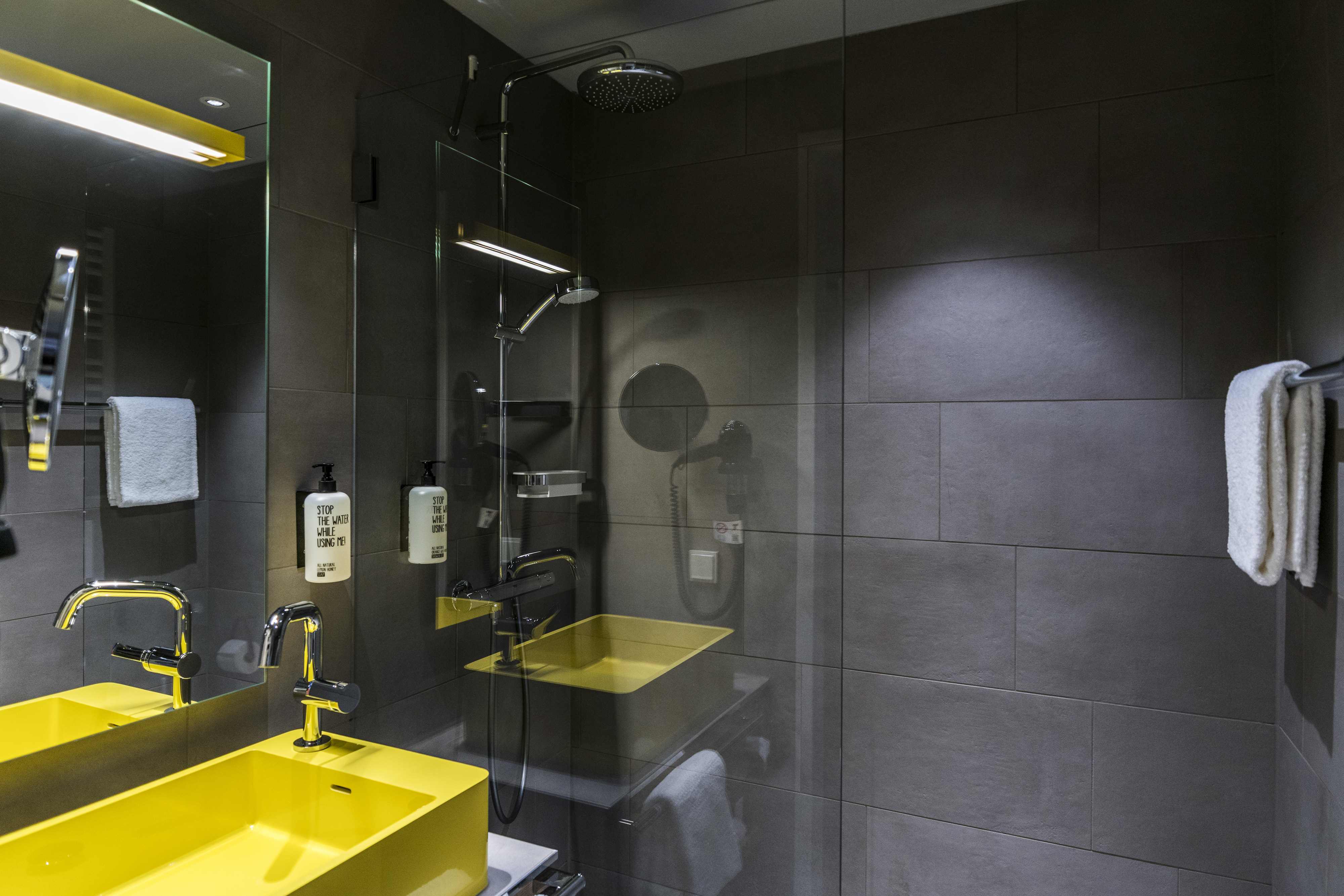 Trotz der vielen Details, wie den Mülleimern im Strohhut-Look und dem Pflanzengrün, das in den Fluren an einigen Stellen von der Decke hängt, wirkt das Design weder unruhig, noch überladen. Klare Strukturen und hochwertige Materialien machen das Konzept zu einer gelungenen Einheit. „Die Investition lohnt sich. Wir hätten auch billigere Bäder einbauen lassen können. Aber wir haben uns für Produkte entschieden, die lang halten und nicht aus Plastik sind. Damit hebt sich die Marke von anderen Playern im Budget-Segment ab“, betont der Hoteldirektor. Verlegt ist im gesamten Hotel entweder ein Holz-Vinyl-Mix oder Stein. Tische aus Marmor und Holz verleihen der Lobby einen Hauch von Eleganz. Der Fokus in den Zimmern lag auf zwei Dingen: Bad und Bett. Die Matratze hat einen zusätzlichen Topper, im Bad ist eine Regendusche verbaut, ein knallgelbes Waschbecken unterstreicht den fröhlichen Designanspruch. „Das ist das, worauf die Menschen Wert legen. Da spielt es keine Rolle, ob das Zimmer 18 oder 30 Quadratmeter groß ist“, ist Lorenz Maurer überzeugt.