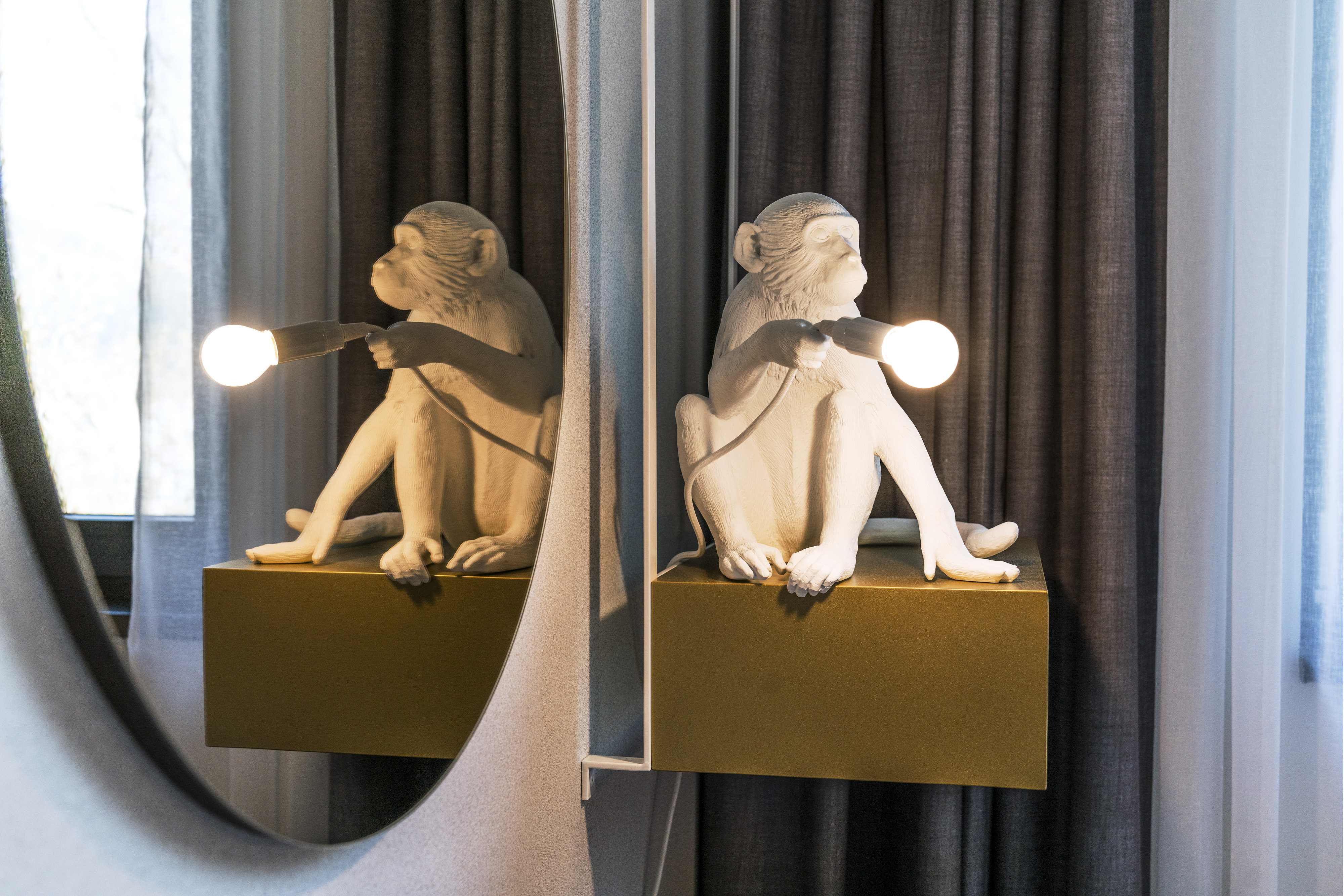 Die Künstlerin fertigte Wandmalereien und -teppiche sowie Kachelwände für das Dschungelfeeling im Ninety Nine mit seinen 107 Zimmern an. Affen, Papageien, Fische und andere Tiere des Regenwaldes zieren ebenso die Wände wie tropische Pflanzen. Auch an den Flurwänden finden sich kunstvoll arrangierte Tier-Abbildungen. In den Zimmern setzt sich das Thema fort. Die Rückwände der Betten zeigen einen Affen, der es sich auf einem Ast gemütlich gemacht hat. Ein Artgenosse in Weiß – nicht gemalt, sondern als lebensgroße Figur – hält, mal hockend, mal an einer „Liane“ hangelnd, eine Lampe. Die abwechslungsreiche Ausstattung hat System: „Es gibt einen Katalog der Illustratorin, aus dem wir individuell auswählen können“, so Lorenz Maurer. Die passende Gestaltung der Kachelwand am Front Desk soll dagegen in allen künftigen Häusern die gleiche sein.