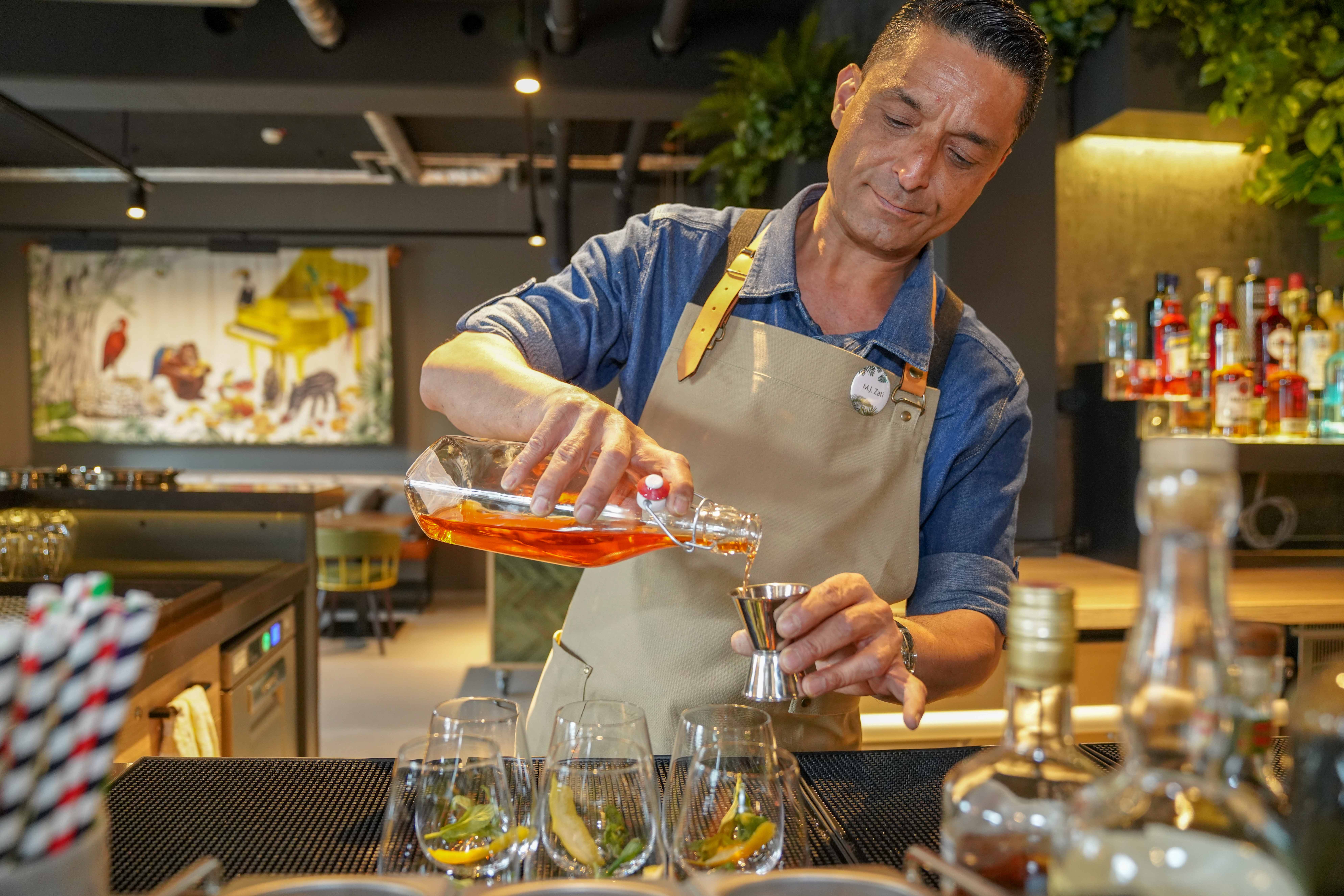 Passend zum Thema Dschungel und Natur ist Nachhaltigkeit Teil des Konzepts. „Das macht für uns nicht nur ökologisch, sondern auch ökonomisch Sinn. Die beiden Puerto-Ricaner habe ich zum Beispiel mit unserem E-Auto in die Stadt gefahren. Eine Aufladung kostet drei Euro, und ich komme damit 430 Kilometer weit“, betont Lorenz Maurer. Gäste können sich E-Bikes im Hotel leihen und damit die Stadt erkunden. Außerdem gibt es auf dem Dach des Ninety Nine in Heidelberg ein Bienenhotel. Die Handseife und das Shampoo kommen aus nachfüllbaren Flaschen der Naturkosmetikmarke „Stop the water while using me“. Abheben will sich Ninety Nine außerdem durch das Food-and-Beverage-Konzept. „Viele Marken in unserem Segment verzichten darauf oder bieten Pizza an. Wir wollten aber etwas ganz anderes machen“, sagt der Hoteldirektor. In jedem Haus wird es eine Bowl-Bar geben, mit gesunden und frischen Zutaten. Die Gäste haben die Wahl zwischen diversen Varianten, Soßen und Toppings. „Mit diesem Konzept wollen wir auch für die Locals interessant sein. Die Gäste sollen satt werden und sich gleichzeitig gesund ernähren können“, sagt Lorenz Maurer. Die Bar des Ninety Nine ist auf verschiedene Gin-Variationen spezialisiert. Weitere Cocktails gibt es als Bottled-Drinks. So spart das Haus nicht nur Personal, sondern auch Platz ein. Die Küche muss nicht groß sein, die Bowls werden am Tresen zusammengestellt.