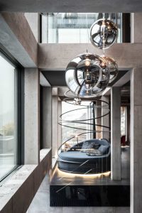 Das „Theater“ beginnt bereits an der Tür zum unterirdischen Verbindungsgang. Direkt über ihr befindet sich eine mit vielen Glühbirnen eingerahmte weiße Tafel, die mit einzeln angebrachten schwarzen Buchstaben an eine klassische Theater-Anzeigetafel erinnert. Hiernach gelangen die Gäste auf einem weichen roten Teppich in den zweigeschossigen Neubau. Dessen Inneres wird visuell vor allem vom angenehmen Kontrast zwischen den feingliedrigen, skelettartigen Betonrahmen und einer von organischen Formen geprägten Innenausstattung bestimmt. Wesentlich hierbei ist die Tatsache, dass die Architekten nicht nur für die Gebäudeplanung verantwortlich waren, sondern auch für das gesamte Interior – ein großer Teil der Möblierung wurde eigens für dieses Projekt geplant und maßgefertigt. Dies nicht zuletzt deshalb, weil es der Eigentümerfamilie ein großes Anliegen war, alles wie aus einem Guss erscheinen zu lassen. Um sicherzustellen, dass dieses Ziel tatsächlich erreicht wird, erhielten die Planer im Zuge eines Planungsprozesses mit intensiven Abstimmungsphasen weitgehend freie Hand.