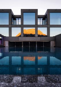 Der 165 Quadratmeter große Außenpool ist integraler Bestandteil des neuen „Mohr Escape“. Er verläuft über die ganze Länge des Gebäudes und ist über eine mittige Einstiegszone mit dem Gebäudeinneren verbunden. Hier erleben die Gäste neben der sich im Wasser spiegelnden Bergkulisse und der gerasterten Gebäudestruktur insbesondere das als Infinity-Pool realisierte Wasserbecken. Es ist weder gefliest noch in Edelstahl ausgeführt, sondern besteht ebenfalls aus durchgefärbtem und sandgestrahltem Sichtbeton. Folglich fühlen die Badegäste sowohl am Beckenboden als auch am Beckenrand die raue Oberflächenstruktur des Betons und erleben einmal mehr den Eindruck eines natürlichen Umfelds. Die kühle blaue, an einen Bergsee erinnernde Farbe entsteht dabei ganz von allein.