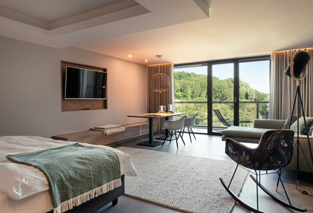„Das Hotel Vier Jahreszeiten hat sich in vergangenen Jahren komplett neu erfunden und sich damit sehr breit für die Zukunft aufgestellt“, kommentiert Hoteldirektorin Alexandra Schenk die feierliche Einweihung. Die 77 Zimmer im neuen Haus am Wald sind in vier Kategorien buchbar, deren Namen auf das Waldthema Bezug nehmen: Treeconomy, Komforest, Forst Class und Retreet Suite. Letztere – acht Stück an der Zahl – wartet nicht nur mit einer Eck-Wohnlandschaft, sondern auch mit einer privaten Sauna im Zimmer auf.