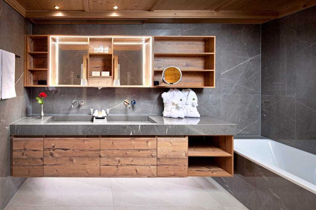 „Design, Funktionalität, Pflegeleichtigkeit“ – so lauteten auch die Wünsche der Inhaberfamilie Pfurtscheller im Fünfsterne-Spa-Hotel Jagdhof in Neustift/Österreich, als sie ihre 32 Badezimmer umbauten. Das Ergebnis sind großzügige Räume, die sich an der Kulisse der Stubaier Alpen orientieren, unter anderem mit furnierten Holzmöbeln und Feinsteinzeug in Marmoroptik an Boden und Wänden. Archifaktur Hotel & Spa übernahm die Planung, Installateurin war die Firma Auer. Conform – Spezialist für seriell gefertigte Badinterieurs mit den Features individueller Maßarbeit – lieferte Unterschränke aus Holzwerkstoffen in Fichte Antik Dekor sowie Spiegel und Leuchten. Zuvor waren während der Planungsphase mehrere Musterbäder umgesetzt worden. Geschäftsführer Armin Pfurtscheller: „Da sich unser Hotel über mehrere Gebäude erstreckt, hatten wir die Möglichkeit, einen Teil für die Umbauarbeiten zu schließen und abzutrennen. Zum größten Teil wurden die Maßnahmen aber ohnehin während unserer Saisonpause durchgeführt.“