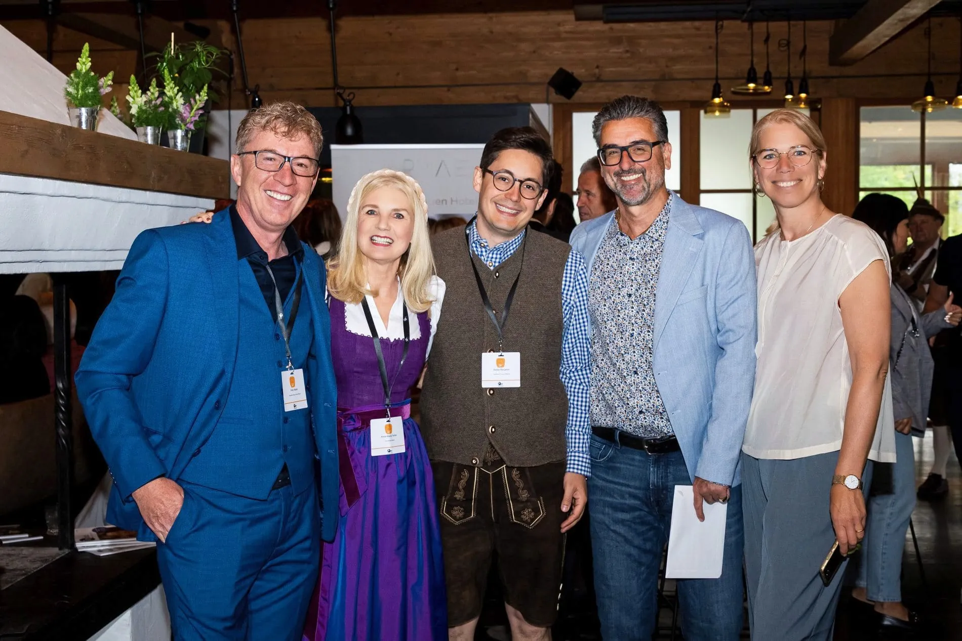 © Mein Tophotel | Michelle HirnsbergerImpressionen vom Mein Tophotel "Family Cup" 2025 im Schlosshotel Kitzbühel: (von links) Peter Mader (Feuerstein Nature Family Resort), Anna-Maria Fäßler (Sonnenalp Resort), Stefan Margesin (Quellenhof Luxury Resort Lazise), Marco Gardini (Hochschule Kempten) und Christine Schröter. -