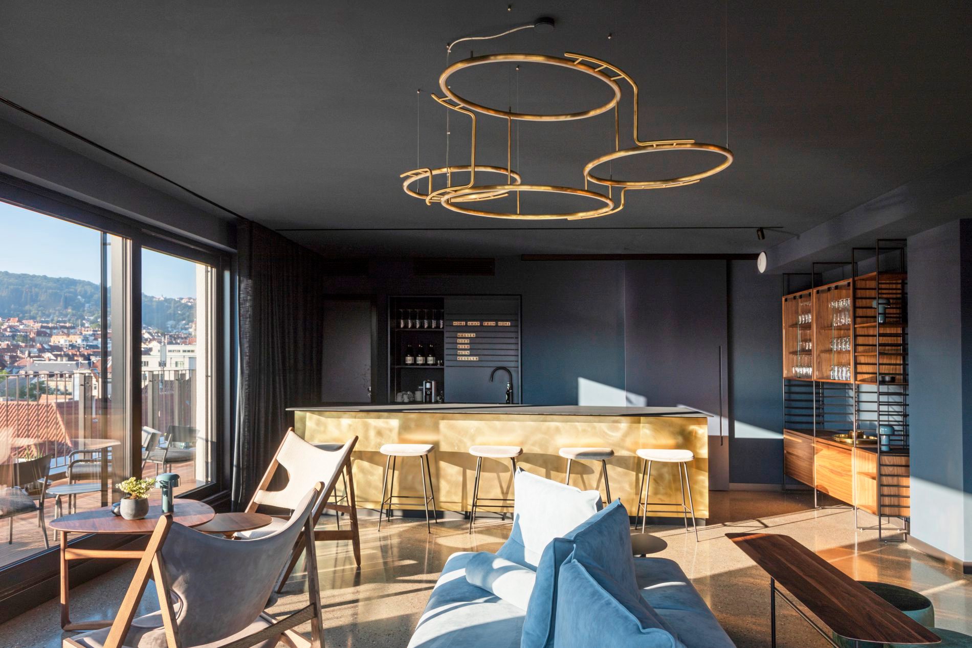 Als Design-Juwelen präsentieren sich die "Lu Suiten" in der vierten und fünften Etage mit ihren mutigen Farben wie Korallrot und tiefem Blau, ihren hohen Decken und einer Raumgröße zwischen 30 und 42 Quadratmetern. Die "Emi Suiten" eröffnen von ihren Terrassen aus einen unverstellten Blick auf die Stuttgarter Innenstadt, zudem ist von dort aus die Rooftop-Lounge zugänglich. Diese ist mit einer Musikanlage sowie einer eleganten Bar aus Messing ausgestattet und kann als exklusive Event-Location gebucht werden. Ansonsten können die Hotelgäste das "Lennarts" als "Wohnzimmer" frei nutzen. Kräftige Blautöne harmonieren dort mit einem grauen Boden im Terrazzo-Look sowie exquisitem Mobiliar aus Italien und Frankreich.
