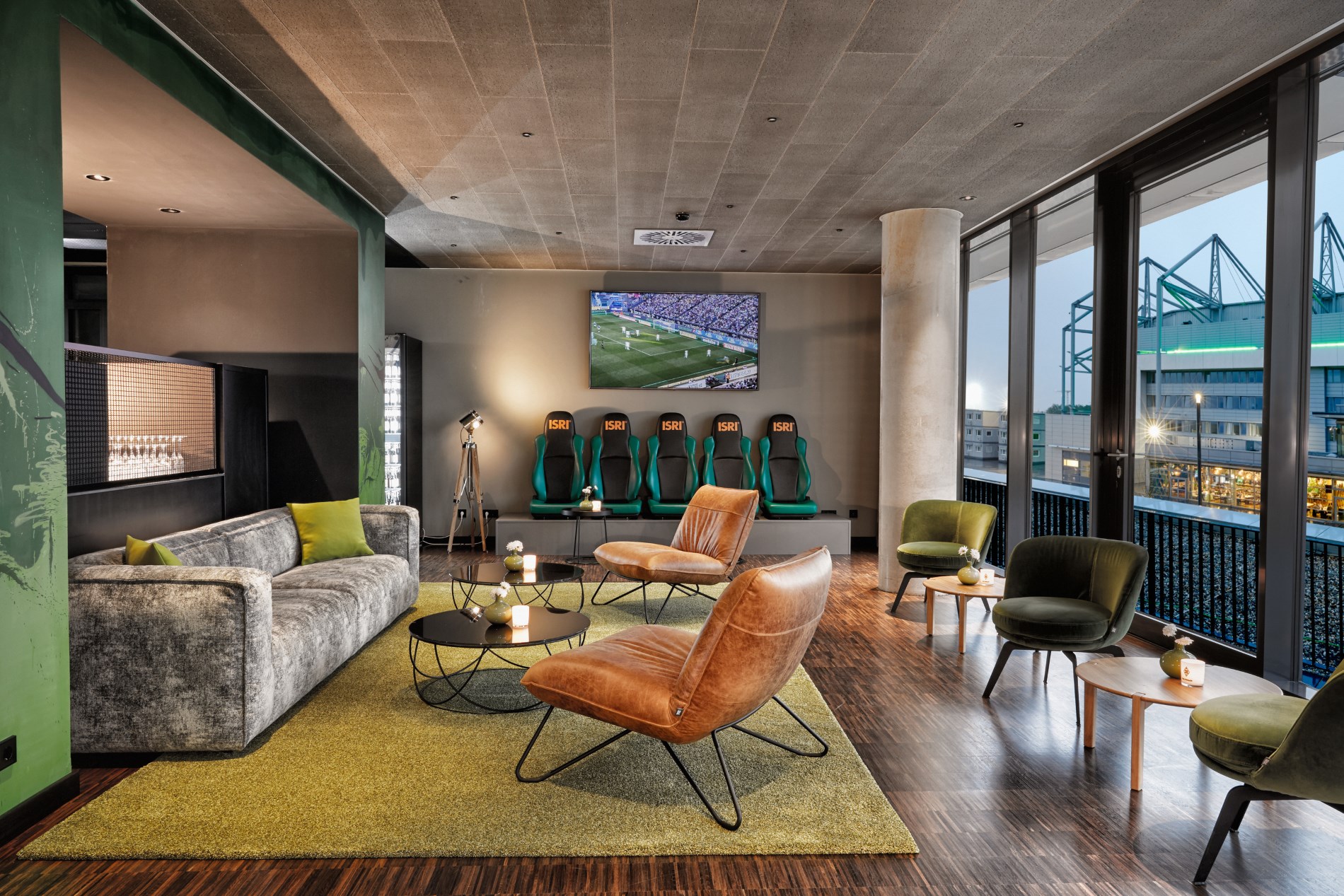 Die ganze Mannschaft in Stuttgart war in den folgenden Monaten im Fußballfieber. Es galt, das Lebensgefühl Borussia Mönchengladbachs in ein funktionierendes Hoteldesign umzuwandeln. Der Plan: Mannschaftsgeist durch ein riesiges Lounge-Sofa vor der Glasfassade vermitteln, einen großen Bildschirm zur Spielanalyse installieren, die Wände wie im Fußballstadion aus rauem Beton fertigen, und in die Zimmer Umkleidebänke sowie einen Bierkühlschrank als Minibar einbauen. Die Ideen schlugen ein wie ein Hattrick. „Sieh her“, sagte Borussia-Präsident Rolf Königs damals zum damaligen Trainer Lucien Favre, „so werden unser Hotel und das Museum aussehen“. Kurz darauf war Favre zwar weg, das Konzept blieb jedoch. Der beeindruckende Bau des jüngsten Zugangs im Borussen-Park stellte die Architekten bei den weiteren Planungen auch vor Herausforderungen: „Acht Grad Neigung in der Fassade und die gigantische Glasfront sind zweifelsohne grandiose Architektur. Darin senkrechte Versorgungsschächte und möglichst viele, komfortable Zimmer einzupassen, war nicht einfach“, erläutert Cord Glantz. Entstanden sind sechs Suiten und 125 Zimmer, drei davon barrierefrei ausgestattet. Der siebengeschossige Neubau beherbergt in seinem T-förmigen Sockelgeschoss neben dem Empfang des Hotels, das von der H-Hotels-Gesellschaft aus Bad Arolsen betrieben wird, auch einen Fanshop und die „Fohlenwelt“, Borussias interaktives Vereinsmuseum, entworfen von Geplan und den Architekten von Arch 22. Außerdem gibt es eine direkte Verbindung zum Stadion.
