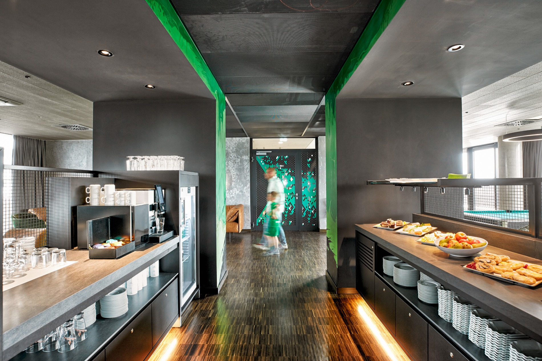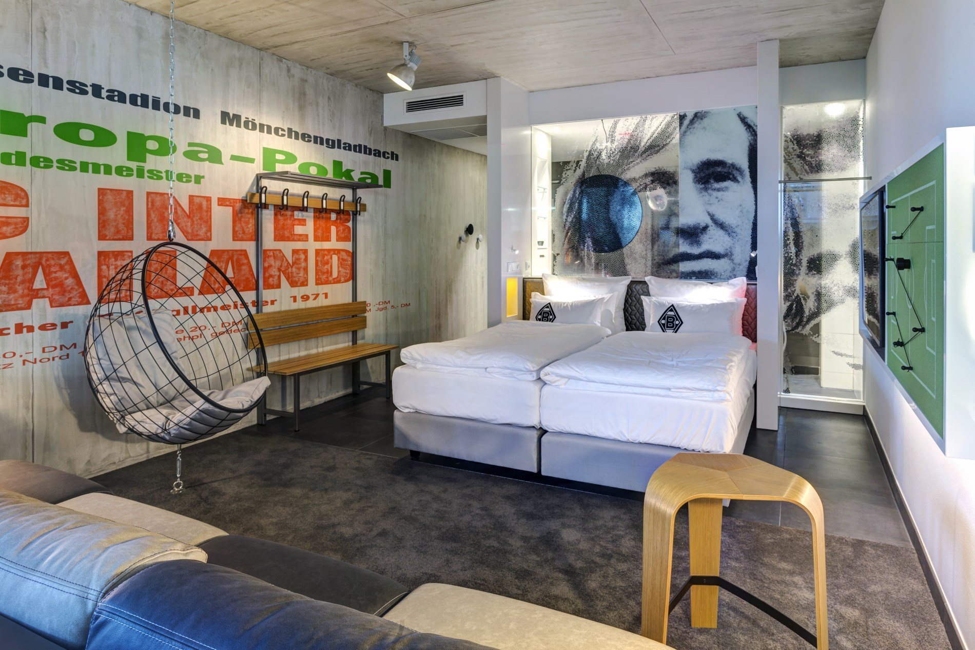Im ersten Stock mit rückspringender Verglasung befinden sich die Lounge und die Suiten, in den Geschossen darüber liegen die weiteren Zimmer mit 23 bis 27 Quadratmetern Fläche. Alle Einheiten punkten mit sportlichem Design und Komfort. Zur Grundausstattung gehören Klimaanlage, Flachbildfernseher, eine Kaffee- und Teestation sowie eine Minibar. Die gelbe und die rote Karte gibt es nur symbolisch – als Nischenbeleuchtung im Betthaupt. In den Bädern blickt Günter Netzer als Siebdruck von der Wand, ein runder Spiegel hängt im Eckigen – einem monolithischen, H-förmigem Designelement aus fugenlosem Kunststein, welches das offen gestaltete Bad vom Bett abgrenzt und das Zimmer strukturiert. Ein umfassendes gastronomisches Angebot sowie attraktive Fitness- und Tagungsmöglichkeiten runden das Angebot ab. Je nach Zimmerkategorie ist der Zugang zur Executive-Lounge inklusive.