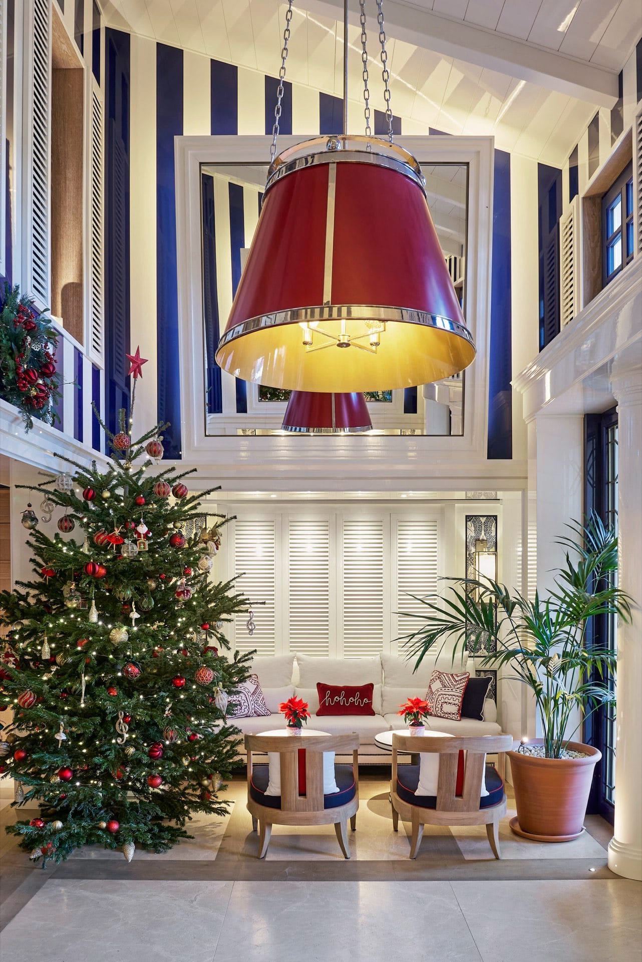 © AREV St. TropezDie Lobby des Arev St. Tropez verbindet maritimes Flair mit Weihnachtsstimmung. Die markante rot-gelbe Pendelleuchte und die blau-weiß gestreiften Wände schaffen eine einladende Atmosphäre für Gäste während der Festtage.