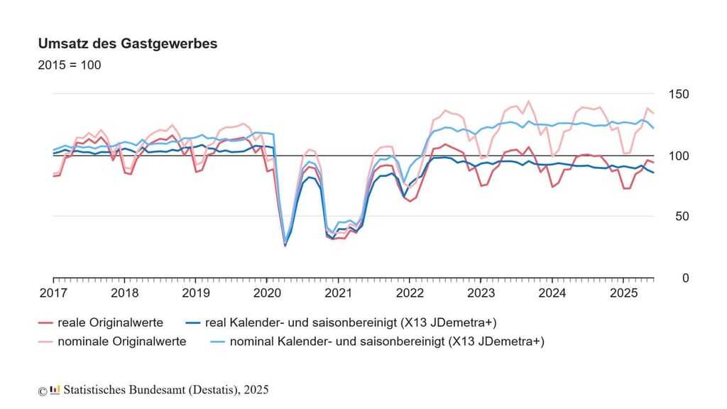 Nur deutliche Preiserhöhungen hätten den Wirten und Hoteliers die Erlöse im ersten Halbjahr 2025 noch einigermaßen gerettet. Nominal lagen die Umsätze nur 0,1 Prozent niedriger als ein Jahr zuvor. Mit einem realen Rückgang um 4,1 Prozent wurde die Gastronomie härter getroffen als Hotels und andere Beherbergungsbetriebe, die einen Rückgang um 2,6 Prozent verkraften mussten.