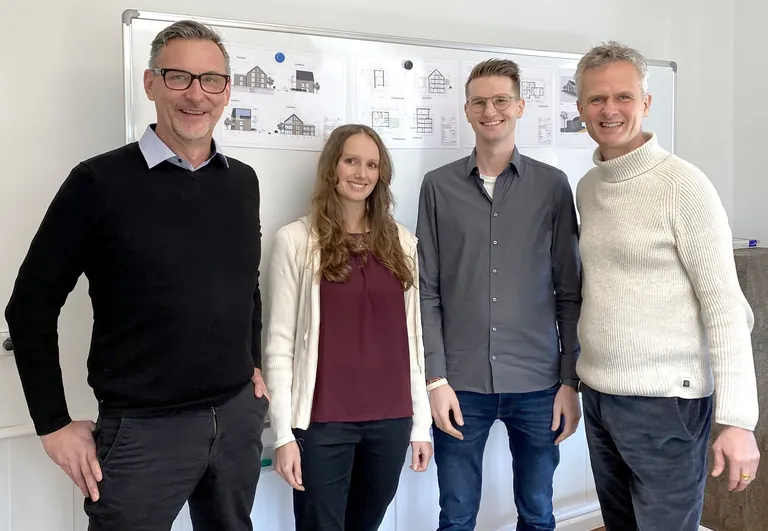 Setzen beim Hotelbau neue Maßstäbe: Anna und Fabian Wiesler (Mitte) flankiert von SHI-Vertriebsleiter Ralf Kärger (links) und SHI-Geschäftsführer Peter Bachmann. - © Sentinel Haus Institut