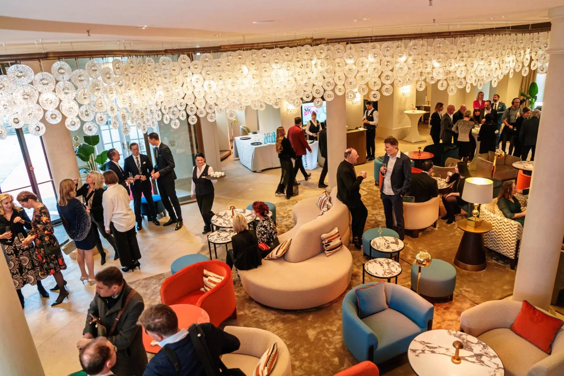 Die Lobby wirkt jetzt heller als zuvor. Dort geht der Blick wie automatisch nach oben. An der Decke schimmern Leuchten, deren Anordnung dem Flusslauf der Elbe nachempfunden wurde. Ihr Licht setzt die farbigen Textiltapeten, die Sandsteinböden und die Kunstwerke passend in Szene. „Früher war die Lobby nicht so stark frequentiert“, erinnert sich der Hoteldirektor. „Deshalb wollten wir sie jetzt zum Wohnzimmer Dresdens machen.“ Sie solle ein internationales Publikum ansprechen, aber auch lokalen Gästen offenstehen. „Wer sich in die Lobby setzt, soll sich wohlfühlen und kann hier prominente Gesichter sehen“, so Schwass.