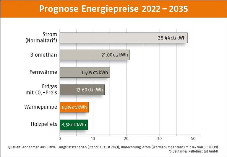 Verlässliche Heizkosten sind nicht erst seit der Diskussion um das Gebäudeenergiegesetz (GEG) in aller Munde. Die Bundesregierung hat nun eine Prognose zu den Kosten verschiedener Energieträger für die kommenden zwölf Jahre veröffentlicht. Demnach schneiden Holzpellets über diesen Zeitraum mit einem Durchschnittspreis von 8,58 Cent/Kilowattstunde (kWh) am günstigsten gegenüber anderen aufgeführten Energieträgern wie Biomethan, Fernwärme, Erdgas und Wärmepumpe ab.