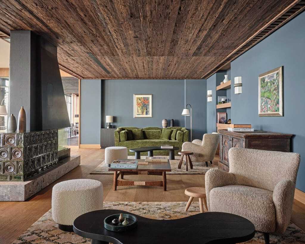 Von großer Bedeutung war die enge Zusammenarbeit mit regionalen Handwerkern – ihre Expertise prägt das Haus maßgeblich. Kacheln der Kaminöfen sowie die Lampenschirme stammen von der Inseltöpferei Klampfleuthner auf der Fraueninsel, bekannt für handgefertigte Keramiken. Möbel wie Schiebeelemente, Schreibtische und Garderoben wurden von der steirischen Firma Kamper gefertigt. Geölte Eichendielen, handgewebte, recycelte Teppiche des LPJ Studios aus Aschau sowie Teppiche des Designers Jan Kath sorgen auf Schritt und Tritt für eine ruhige Atmosphäre. In den Bädern treffen dunkler Naturstein und helle Eiche aufeinander. Besonders kunstvoll ziert eine getupfte Bordüre des heimischen Malers Christian Schwaiger die Wände der Gästezimmer – verteilt auf insgesamt 300 Meter.