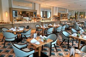 sowie den lichten Grüntönen an Wänden, Decke und in den Stoffen. „Mit der Helligkeit und Optik ist auch das Thema ‚Wintergarten‘ eingeflossen“, erzählt Franco Esposito. „Der Stil des Alstersalons besitzt eine Leichtigkeit und zeigt gleichzeitig im Design das Beste vieler Welten. Hier trifft die Hamburger Alster auf exotische Einflüsse.“ So sind die Wände an den Stirnseiten mit hellgrünen Tapeten bespannt, auf denen florale Muster, Palmen und Papageien abgebildet sind. Auch die weiße Decke ist mit einem Petrolton abgesetzt, und die als Sondermodell in Italien gefertigten Stühle sind mit blauen Stoffen bezogen.