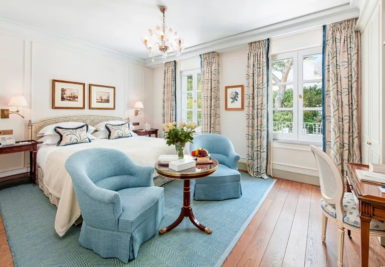 Die Zimmer beheimaten noch einige Ornamente, die auf die Eröffnung des Hotels im Jahre 1870 datiert sind: Hohe Decken, Zierleisten, antike Kronleuchter und Louis-XV-Möbel. In einer Beige- und Hellblau-Palette verleihen die außergewöhnlichen Mahagoni- und Bronzemöbel von Maison Tallarda den Suiten einen eindrucksvollen Charakter. red/sar