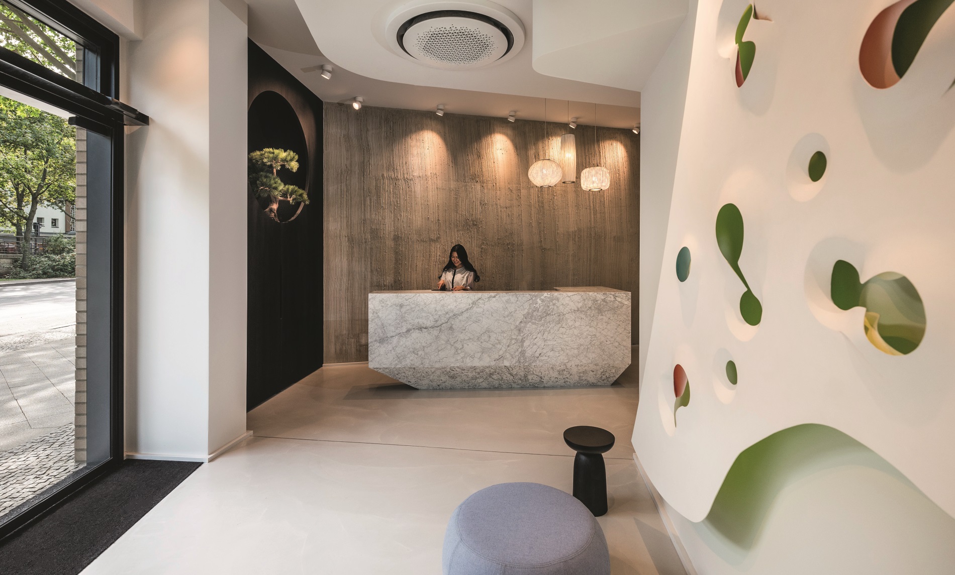 Für das Interieur zeichnet Tilo Weber von Jim Knoepfle Architects Berlin verantwortlich. In Abstimmung mit dem Bauherrn hat dieser sich beim Design und den verwendeten Materialien vom luxuriös-geradlinigen Stil japanischer Teezimmer inspirieren lassen und damit eine Hommage an die Vorbesitzer des Grundstücks geschaffen. „Ich wollte Räumlichkeiten ohne viel Chichi, ein schlicht-elegantes Ambiente, in dem der Gast die Hauptrolle spielt. Die minimalistische Ästhetik Japans passt perfekt dazu“, erklärt Felix Gädeke. Auf diese Formensprache trifft der Gast des Gaijin, was wörtlich übersetzt „Ausländer“ oder „Nichtjapaner“ bedeutet, bereits in der Lobby.