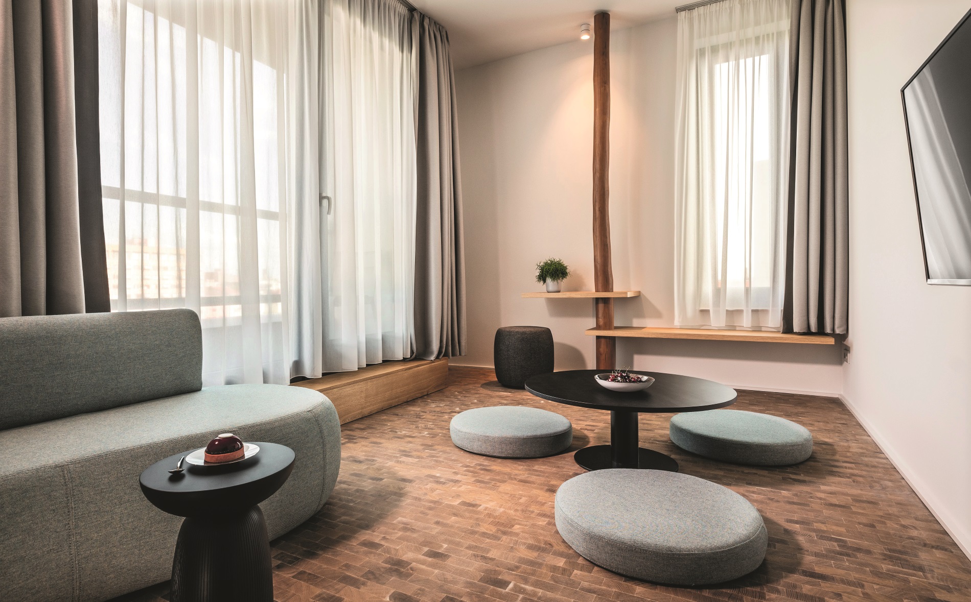 Durch das gesamte Hotel ziehen sich Anklänge an die Wohnkultur Japans: Lampen im Stil japanischer Lampions, Paravents aus Holz und Shoji-Papier als Raumteiler sowie landestypische bodennahe Sitzmöglichkeiten. Für Helligkeit sorgen große Fensterfronten, Eichendielen und robustes Hirnholzparkett schaffen ein angenehmes Raumklima. Komplettiert wird die Ausstattung durch maßgefertigte Doppelbetten aus Massivholz, die über dem Boden zu schweben scheinen. „Qualitativ hochwertige Produkte, Nachhaltigkeit, aber auch ein hohes Maß an Flexibilität waren uns bei der Planung und Ausstattung der Zimmer wichtig“, sagt Ronald Spicale. Das Mobiliar ist bis auf die Doppelbetten verschiebbar, sodass bei Bedarf Platz für Aufstellbetten und /oder Kinderbetten geschaffen werden kann.