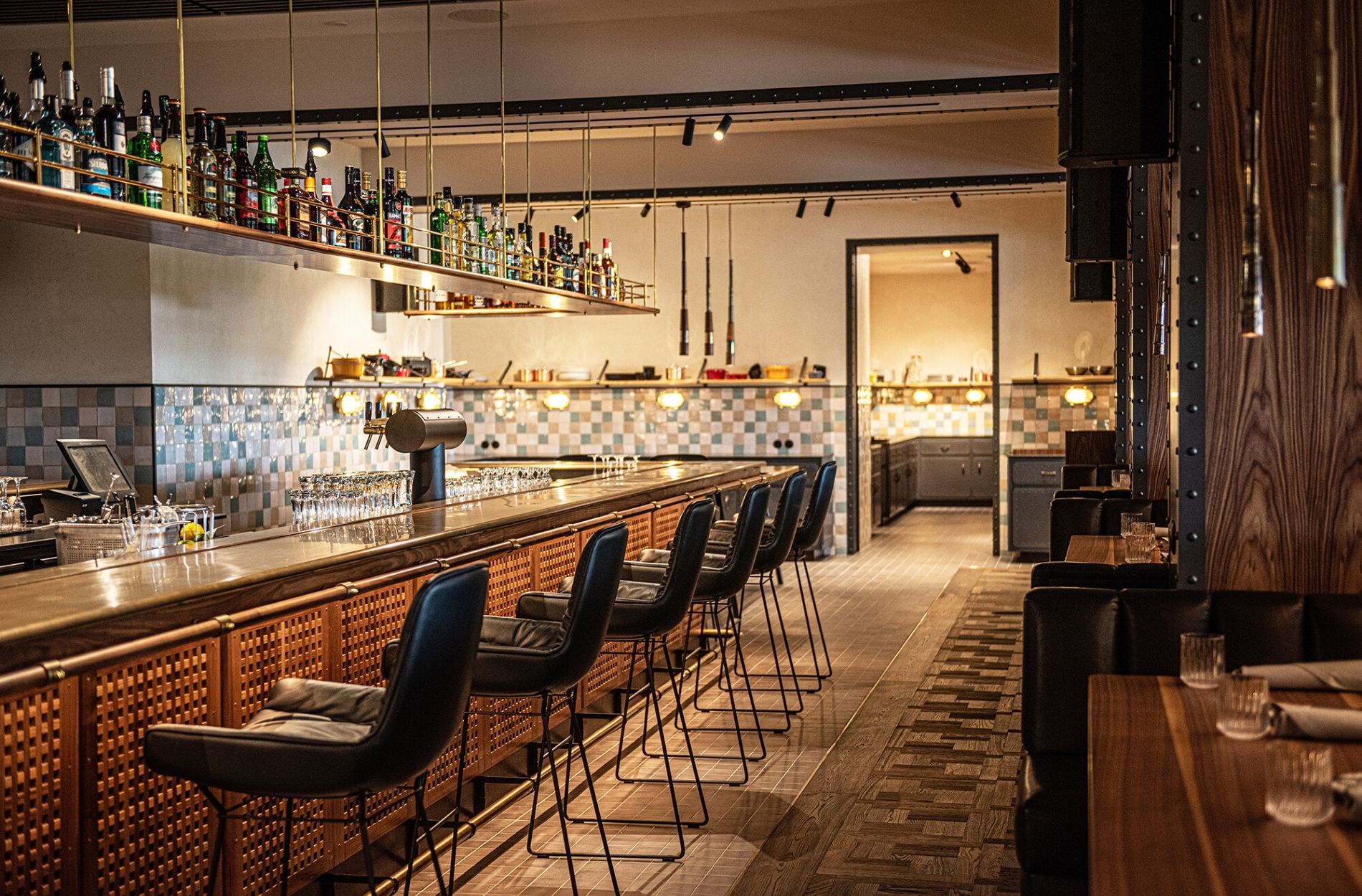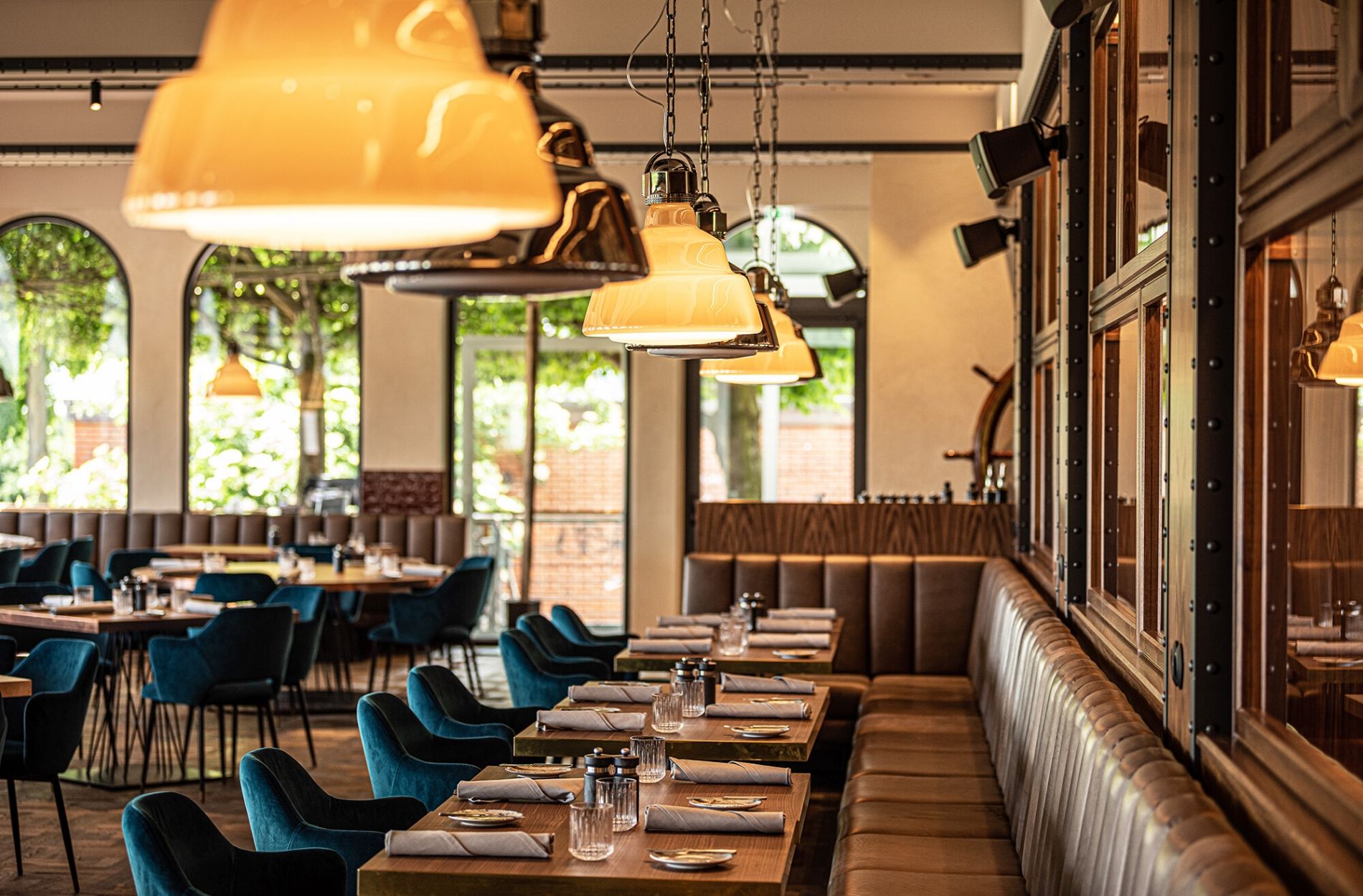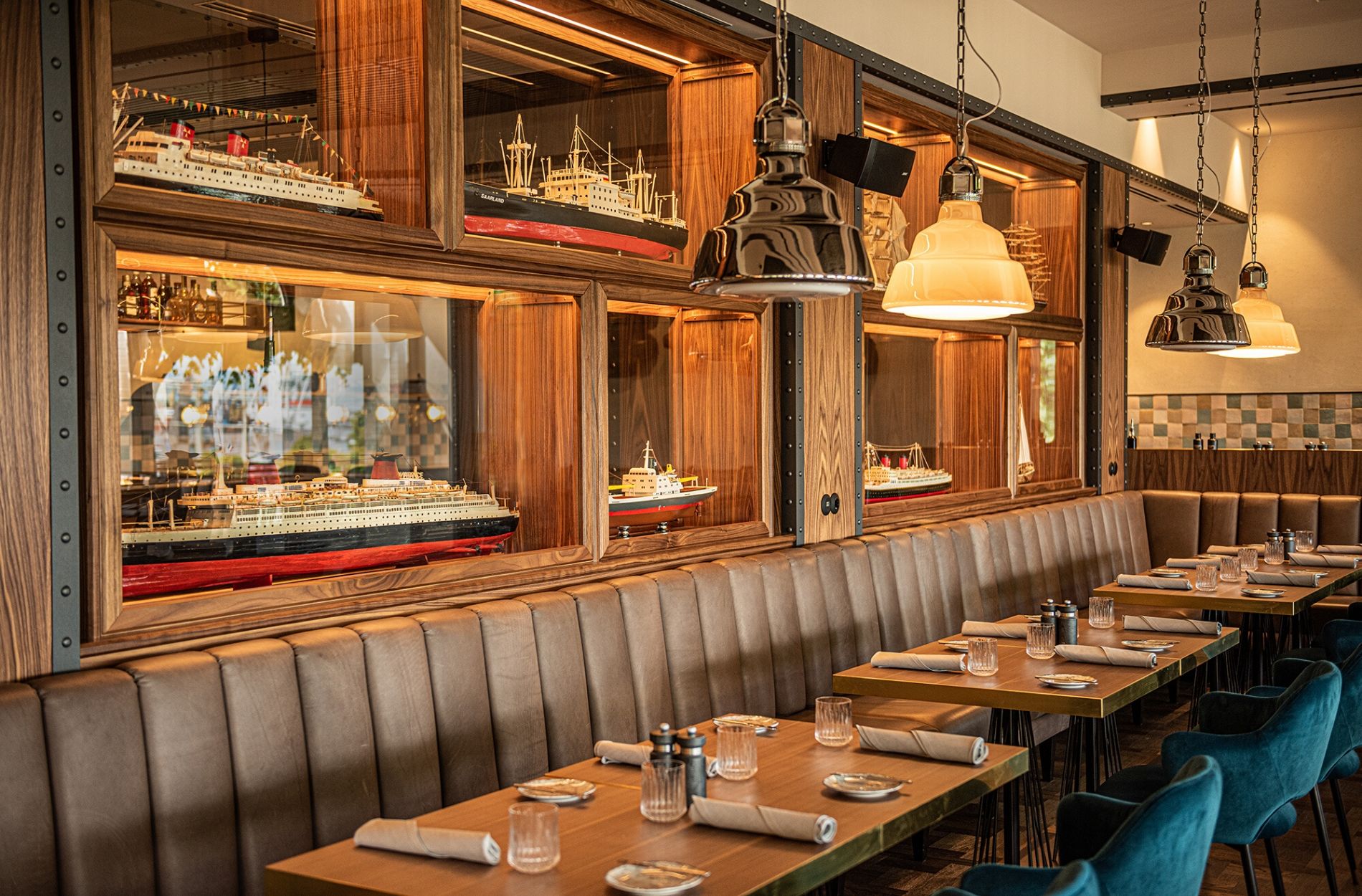 Umgeben von historischen Schiffsmodellen servierte das Team im Restaurant „Port“ 40 Jahre lang regionale und saisonale Spezialitäten vor der Kulisse des Hamburger Hafens. Auch nach dem Umbau bleibt die Seefahrtsgeschichte allen Gästen erhalten – das Interior wurde jedoch edler und moderner gestaltet: Neben Fernrohrlampen schaffen die 583 handgefertigten Wandfliesen, holzverkleidete Details sowie die Bestuhlung in Petrol Raum für kulinarische Ansprüche in aufgelockerter, hanseatischer Atmosphäre. Das Licht- und Klimasystem wird digital gesteuert. Insgesamt finden in den frisch renovierten Räumlichkeiten 187 Gäste Platz, 80 weitere Sitzmöglichkeiten bietet die 170 Quadratmeter große Sommerterrasse.