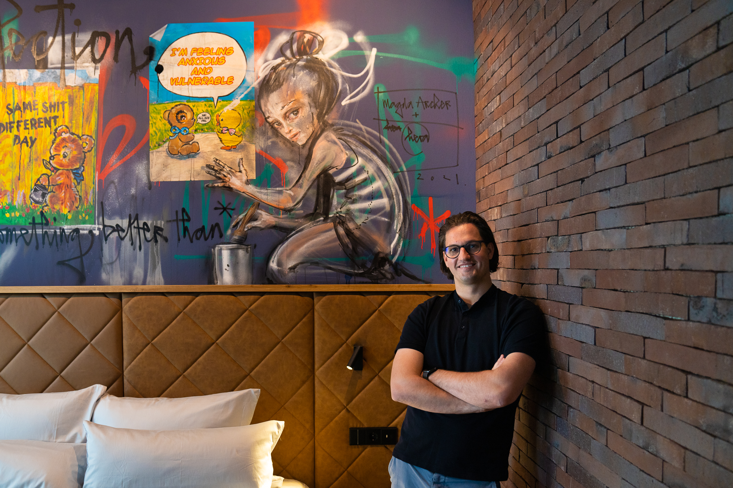 "Es gibt mehr als 140 Access-Points, damit die Gäste in jedem Winkel optimales WLAN haben", so der Geschäftsführer. "Bei der Planung stand fest: neben Klinker, Stahl und Glas brauchte es noch Farbe, Charakter und Leben", sagt Wenk. Schnell sei klar gewesen, dass das Konzept ähnlich dem des Restaurants "Liebesbier" sein sollte, das sein Vater eröffnet hatte. Es liegt direkt gegenüber des gleichnamigen Urban Art Hotels und verfügt über Street-Art-Werke, die Vater und Sohn in Galerien erstanden haben. "Aber wir wollten im Hotel keine 67 Einzelstücke", sagt Wenk. Den Rest hat er mit Jasmin Siddiqui bei einem Fläschchen "Miss Hoppy" besprochen. Mit dem Ergebnis ist er sehr zufrieden, auch wenn ihn die "heiße Phase", als Handwerker und Künstler parallel im Haus arbeiteten, viel Kraft kostete. Mehr als 50 Künstler am Werk Das Liebesbier ist nicht das erste Hotel, das in der Gestaltung auf Street-Art setzt.